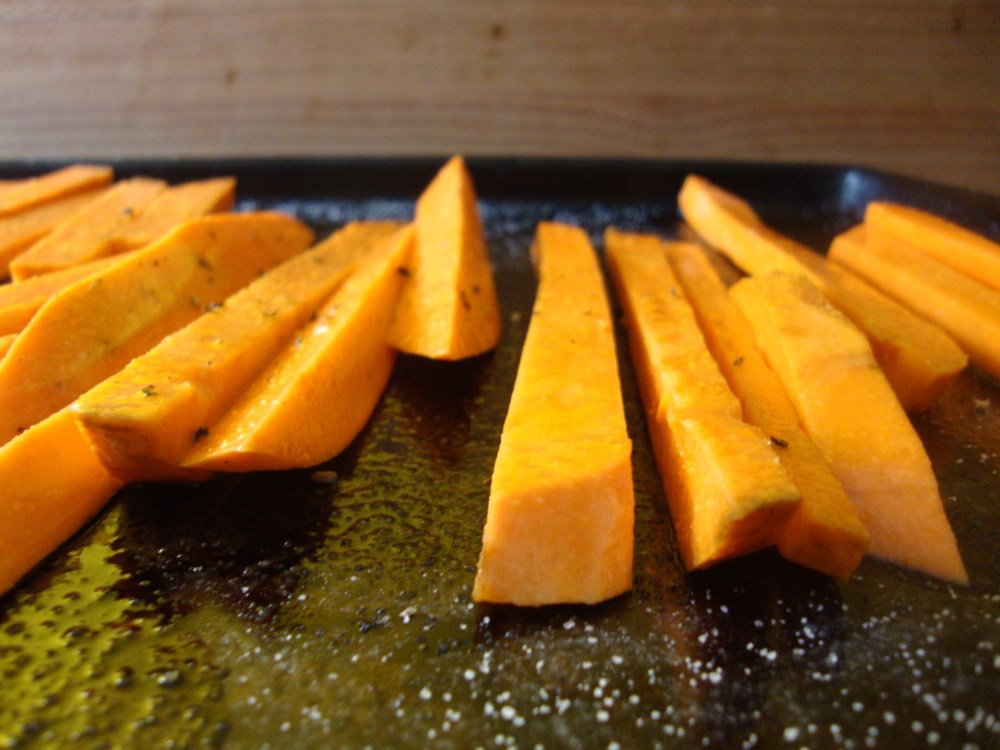 To cut french fries, I first cut the yam in half or thirds width-wise. Then, standing the half up on the cut side, slice it vertically like thin slices of bread. Then rotate the whole thing and slice in the other direction to get “fries”. Put them in the pan about 2 yam fries deep, and drizzle with a little olive oil (a dainty amount is more than enough). Put them in the oven on “broil”.