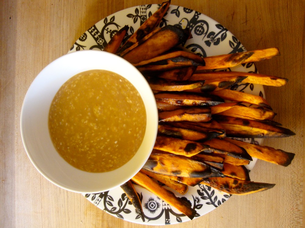 I have to credit Meta for sharing this amazing recipe with me. Though we had been making yam fries together for many years previously, finding out the secret of the miso gravy was a revolution! Before, we used the pre-bottled stuff from the Naam restaurant in Vancouver. The home-made version is more exciting, because it costs less and changes every time you make it! Also note that you can keep all of these ingredients kicking around your kitchen for quite a while, just waiting for that one late-night when they are all necessary…