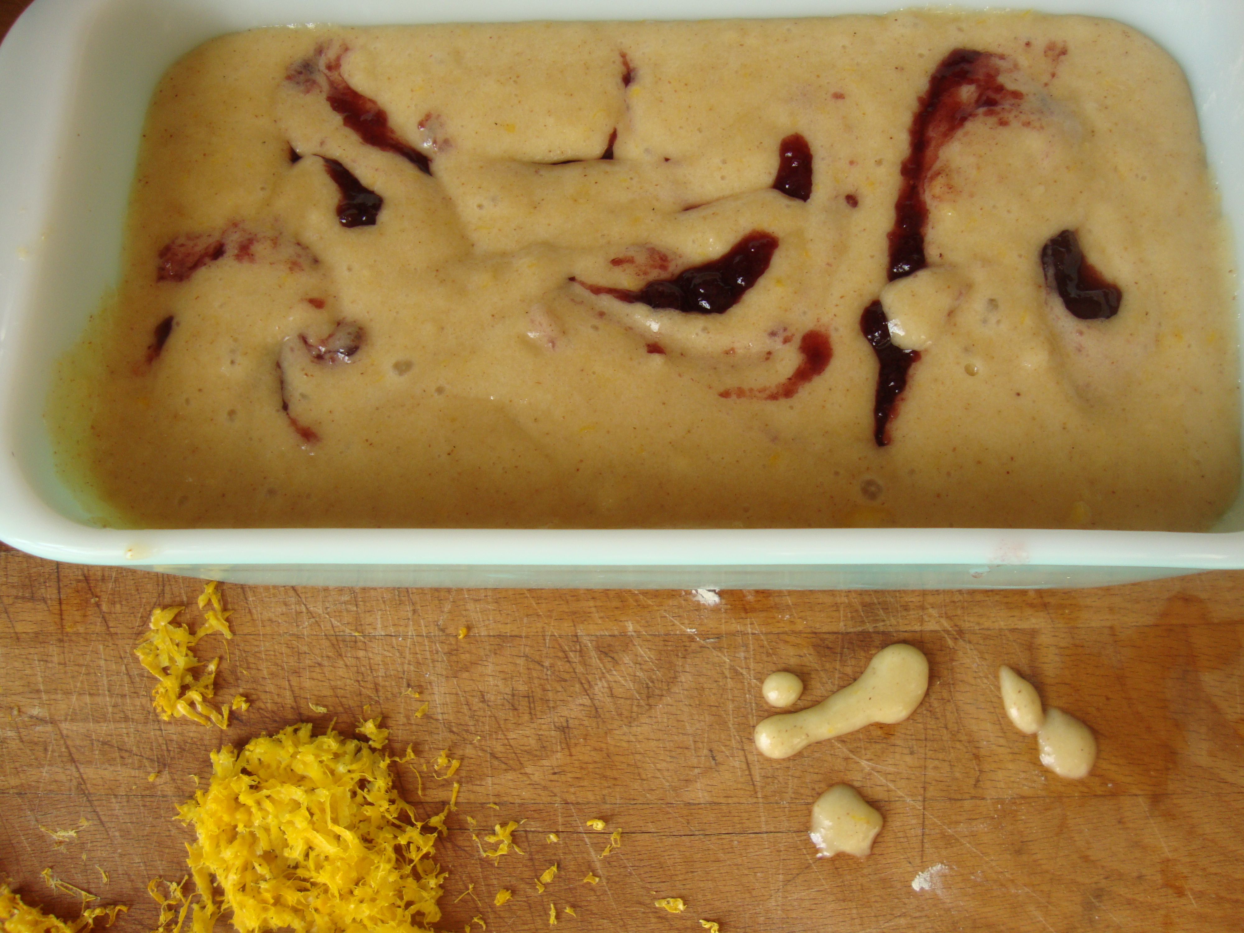 - mix the blackberry jam into the fresh blackberries. Pour the blackberry mixture into the filled loaf tin and gently swirl the blackberries into the batter with a teaspoon occasionally moving the spoon up and down.