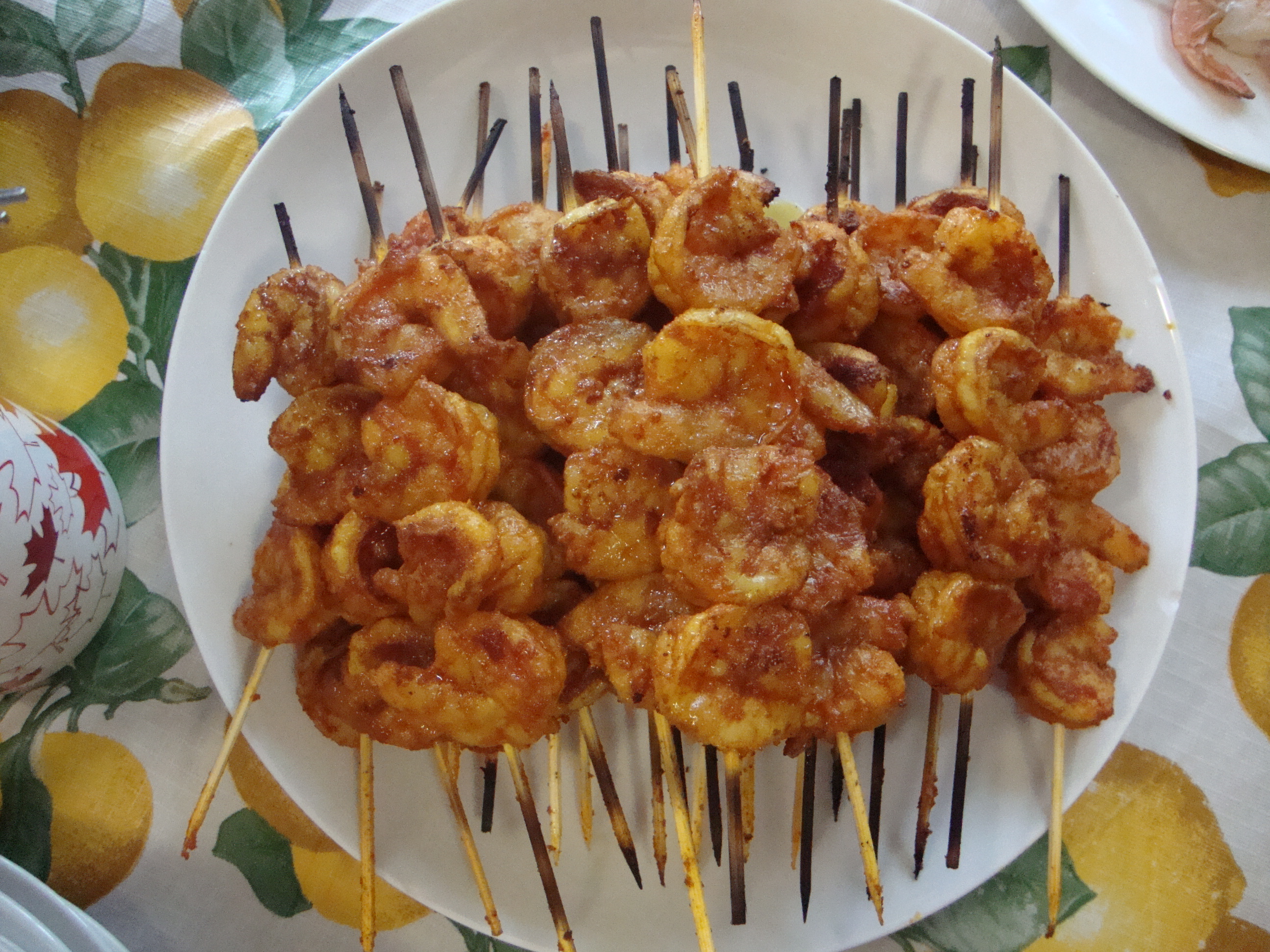 DSC02733When I was in high-school my mother worked at Walden Books.  She would buy me books from the sale table with her discount.  She was very attuned to my interests so she brought home big coffee table art books and cook books.  One of these was a giant British volume on Asian cookery.  I was particularly fond of the sections on Malaysian and Burmese food and cooked almost everything from those chapters.  I now realize that the book was impressively well researched and specific about the subtle differences between the various cuisines of Asia BUT it was written in an era when westerners could not dream of finding authentic ingredients in England or North America.  I no longer have the book, but I copied a couple of my favourite recipes into a cooking notebook that I started keeping when I was twelve years old (the first page of the diary is dated December 25th, 1986).  I recently dug this childhood food notebook out because I was looking for a Burmese broiled prawn recipe that I used to make for my dad whenever he would fire up a barbecue.  My dad and I both loved spicy food.  Of all the food that I made for my dad this recipe was his favourite, so I wanted to make it for his memorial.  I was worried that it would not be as good as I remembered but it was delicious and it is made from ingredients that you can find most anywhere.  If you want to eat these shrimp Jack Berry style, crack open a beer and consume your meal while sitting in a lawn chair, admiring the sunset and occasionally commenting on how happy and lucky you are.
