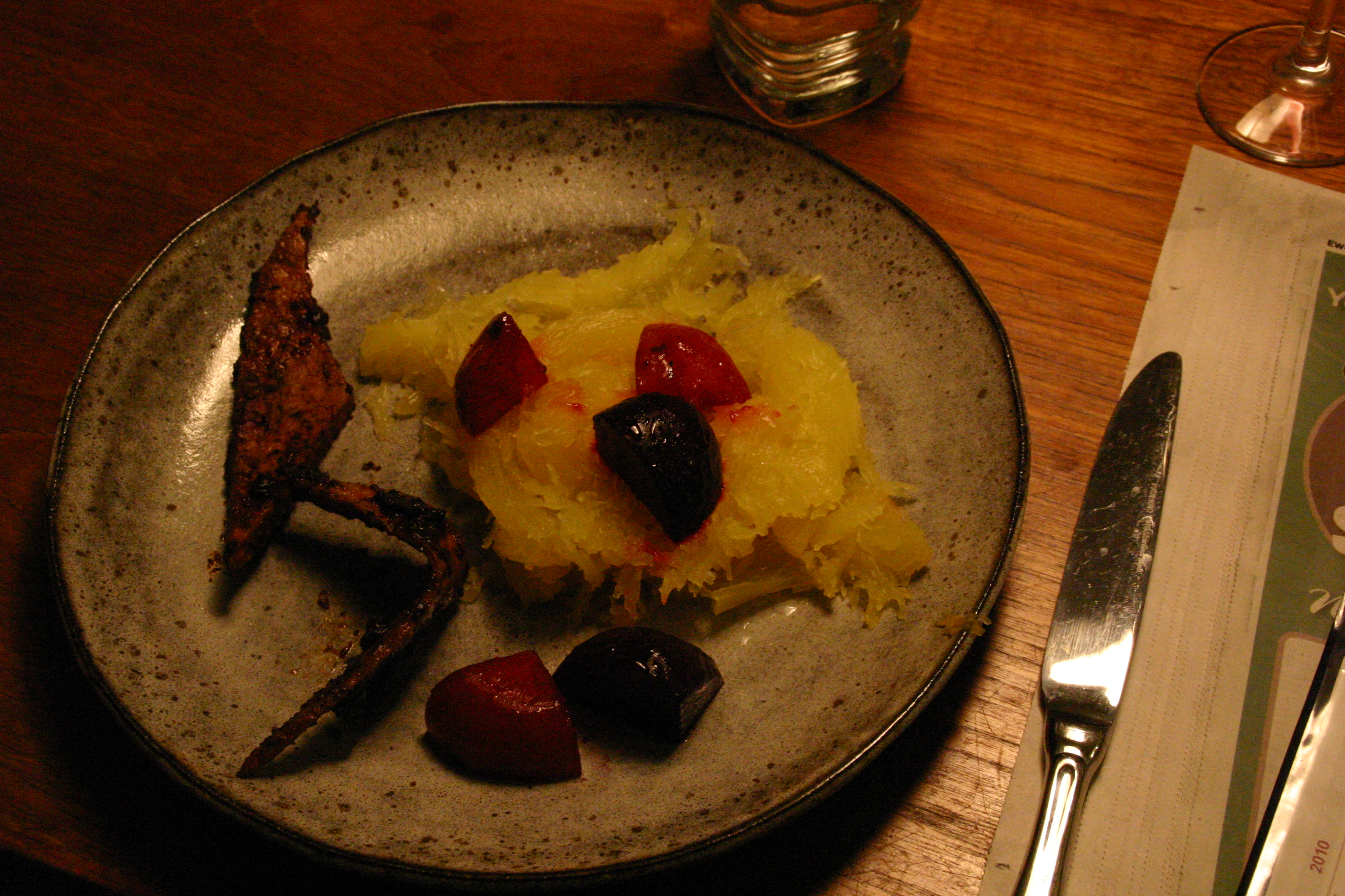 I cooked! Finally. Pictured is a little late-night grub version. It’s baked spaghetti squash with these delicious little beets on top, and BBQ marinated tofu on the side.