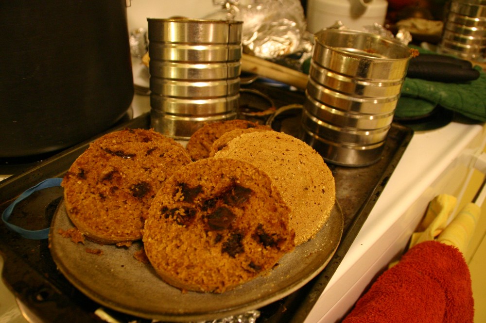 4. Pour the boiling water around the cans to a level about halfway up the cans. Turn the heat down to a low simmer, and cover the pot. Let the bread steam for 2 hours (for smaller can molds) to 3 hours (for coffee can-size molds), checking occasionally to add more water as needed. When done, the bread will have risen some, though not a lot, and will be firm to the touch through its foil or paper cover. Remove the cans from the pot and let the breads cool in the cans for about an hour before reversing out (Ha! I did not do that. We ate the bread hot and steaming as soon as it was ready) Serve in thick slices.