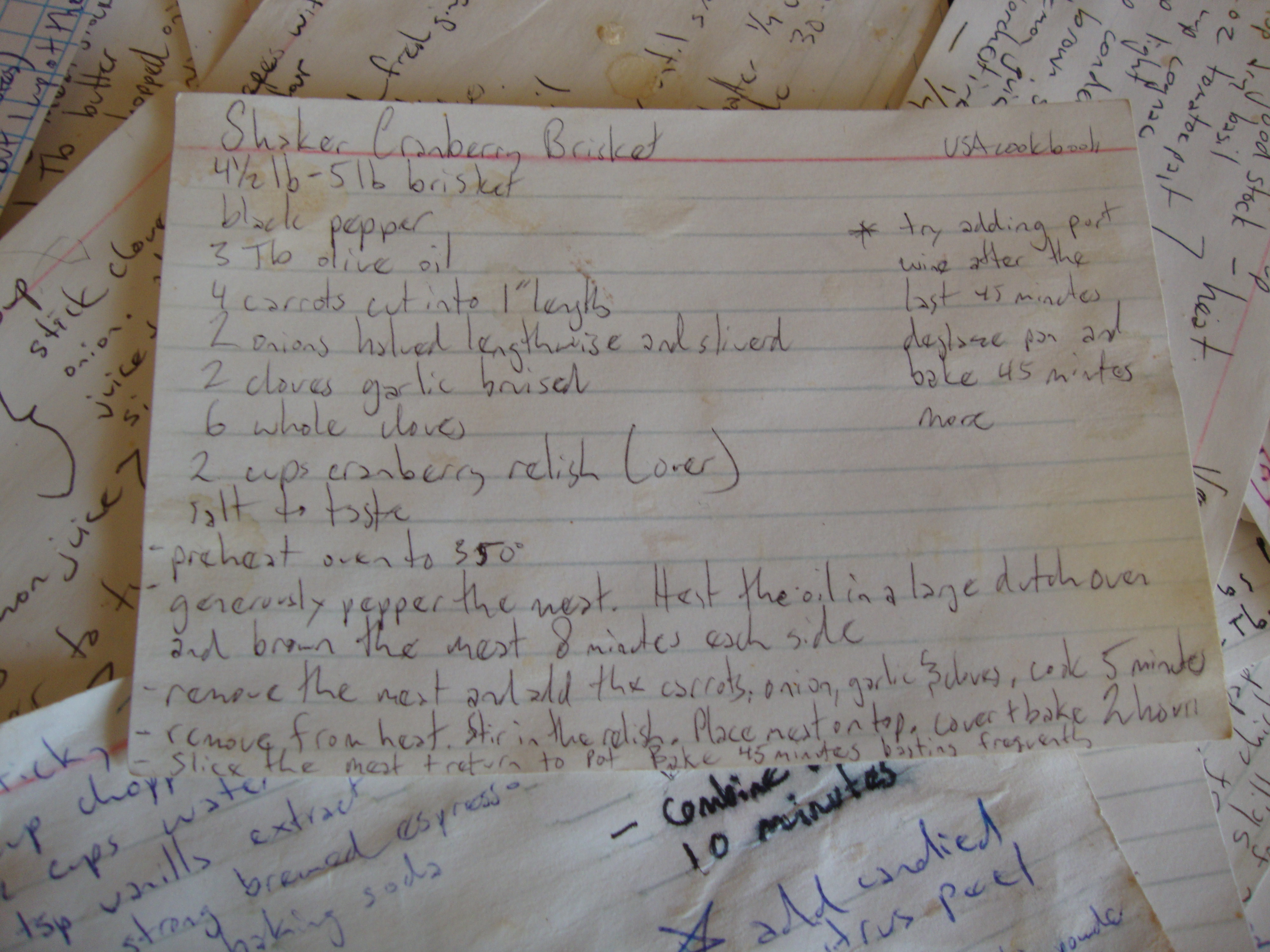 My Cranberry Brisket is adapted from Sheila Lukins recipe for Shaker Cranberry Brisket in her USA cookbook. I have added wine to the recipe and I am pretty sure that Shakers don’t drink so…… I also skip the cloves and add five spice powder instead. Either one is good. Brisket is a tough but flavourful cut of beef that requires a long cooking time to become tender. I love eating BBQ brisket in Texas. Last time Chris and I took the Amtrack from Austin to Fort Worth the man we ate dinner with told us his recipe for making BBQ brisket with such love and enthusiasm. I do not want to make my own BBQ brisket though. For one thing I don’t own a smoker. Secondly, It takes a REALLY long tome to do it right. Thirdly, I cannot imagine that I would be able to do it better than the folks in Texas do. I’ll leave it to the experts and enjoy it once a year when I go to Texas. This is a pretty good brisket recipe though. I make it once a year usually around Chris’ birthday, with my leftover cranberry relish form Thanksgiving. The cabbage recipe is from MadhurJaffrey’s Quick and Easy Indian Cooking. It is delicious and simple, like all of the recipes from that cookbook. I made the Parsnip and Carrot Latkes up myself. I am very proud of this menu!