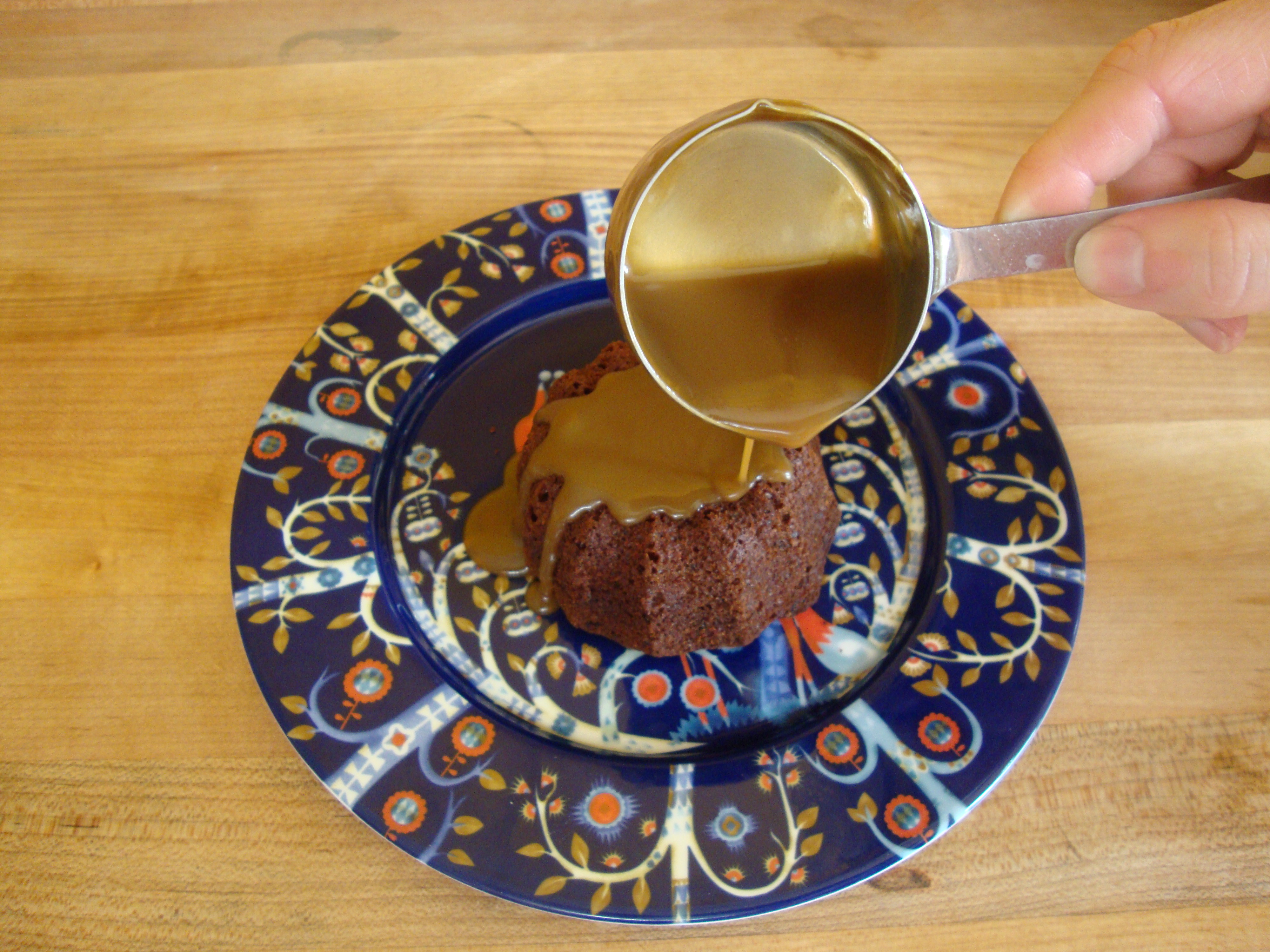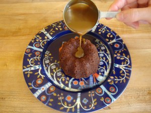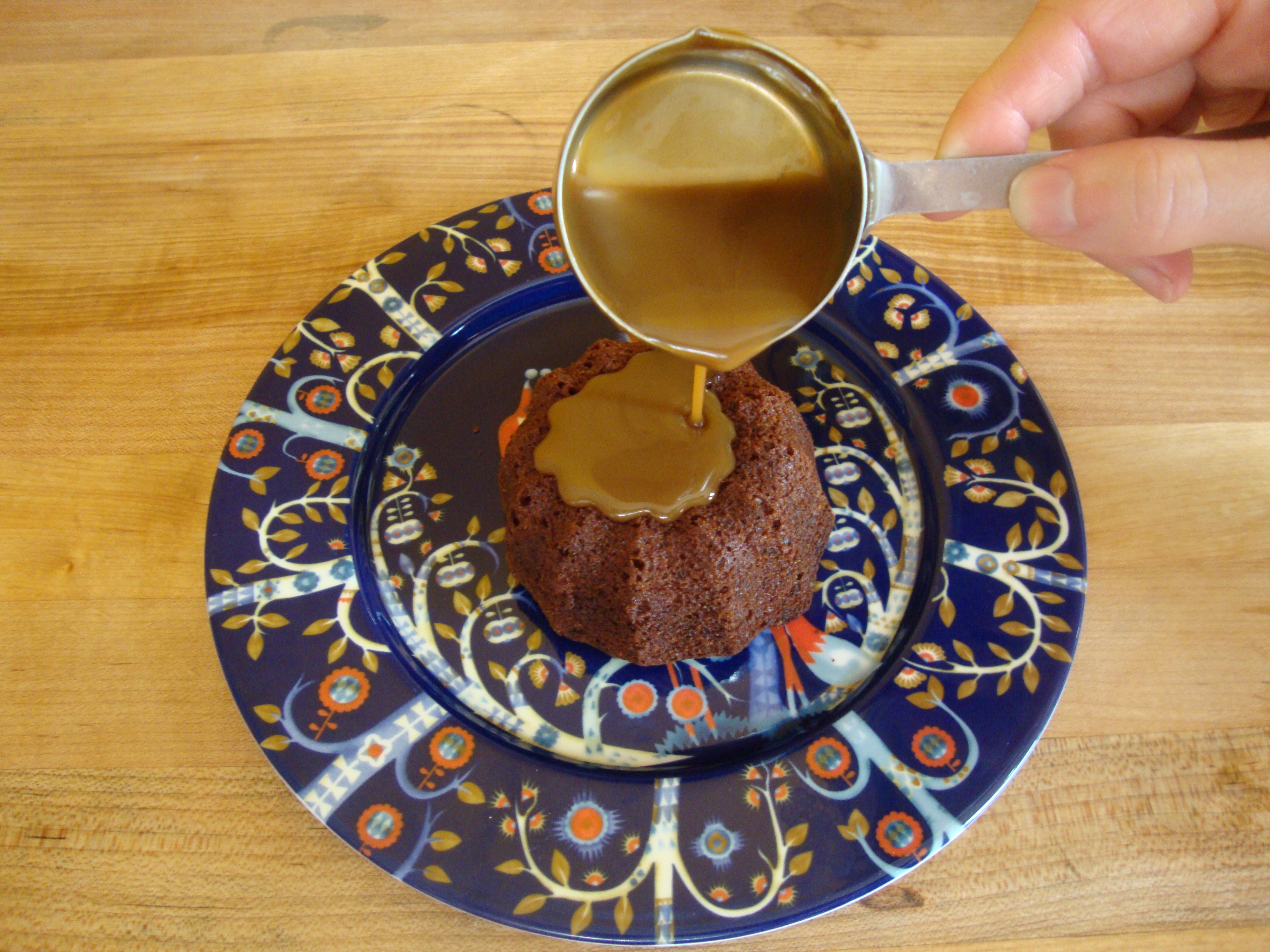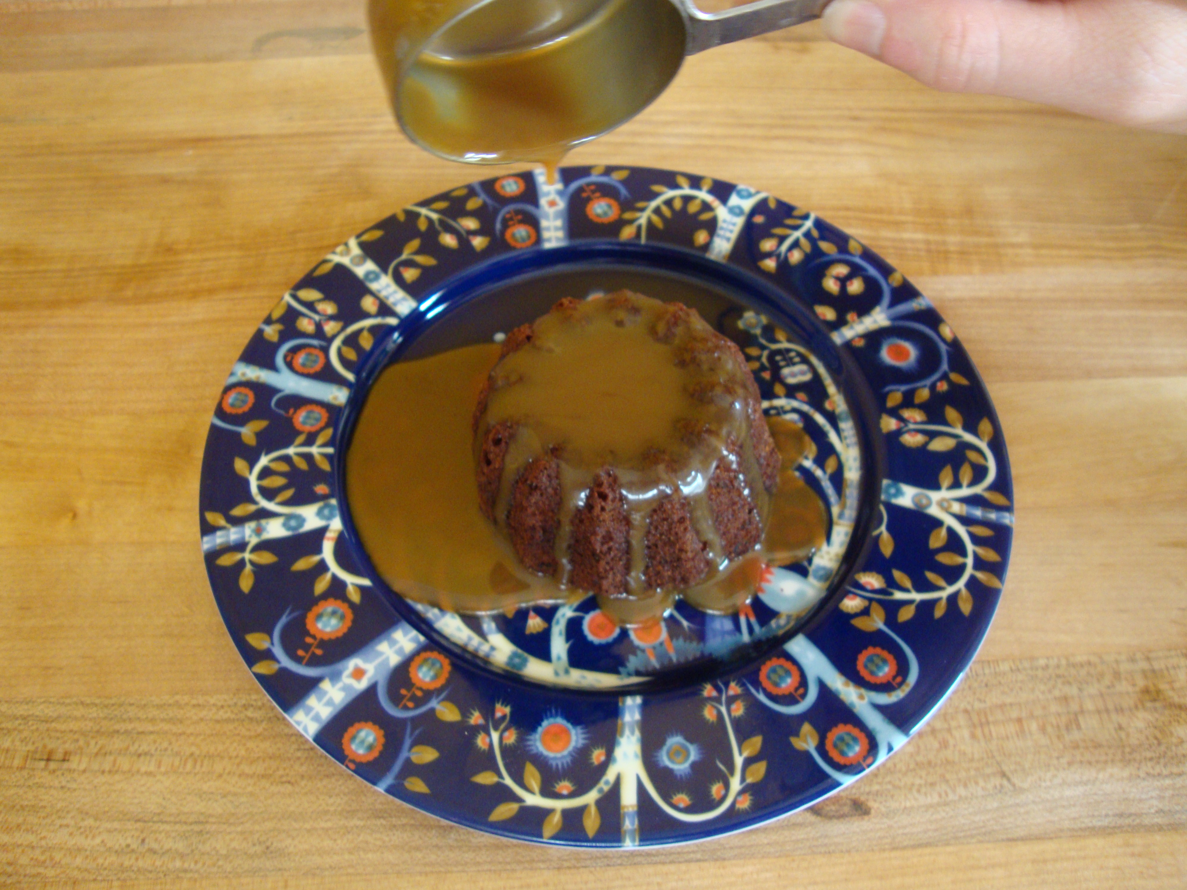 - Turn the cakes out of their tins and plate them individually. Pour the sticky toffee sauce over them. Serve hot.
