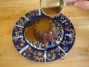 - Invert the cake onto a large plate and pour the sticky toffee sauce over it. Serve hot.