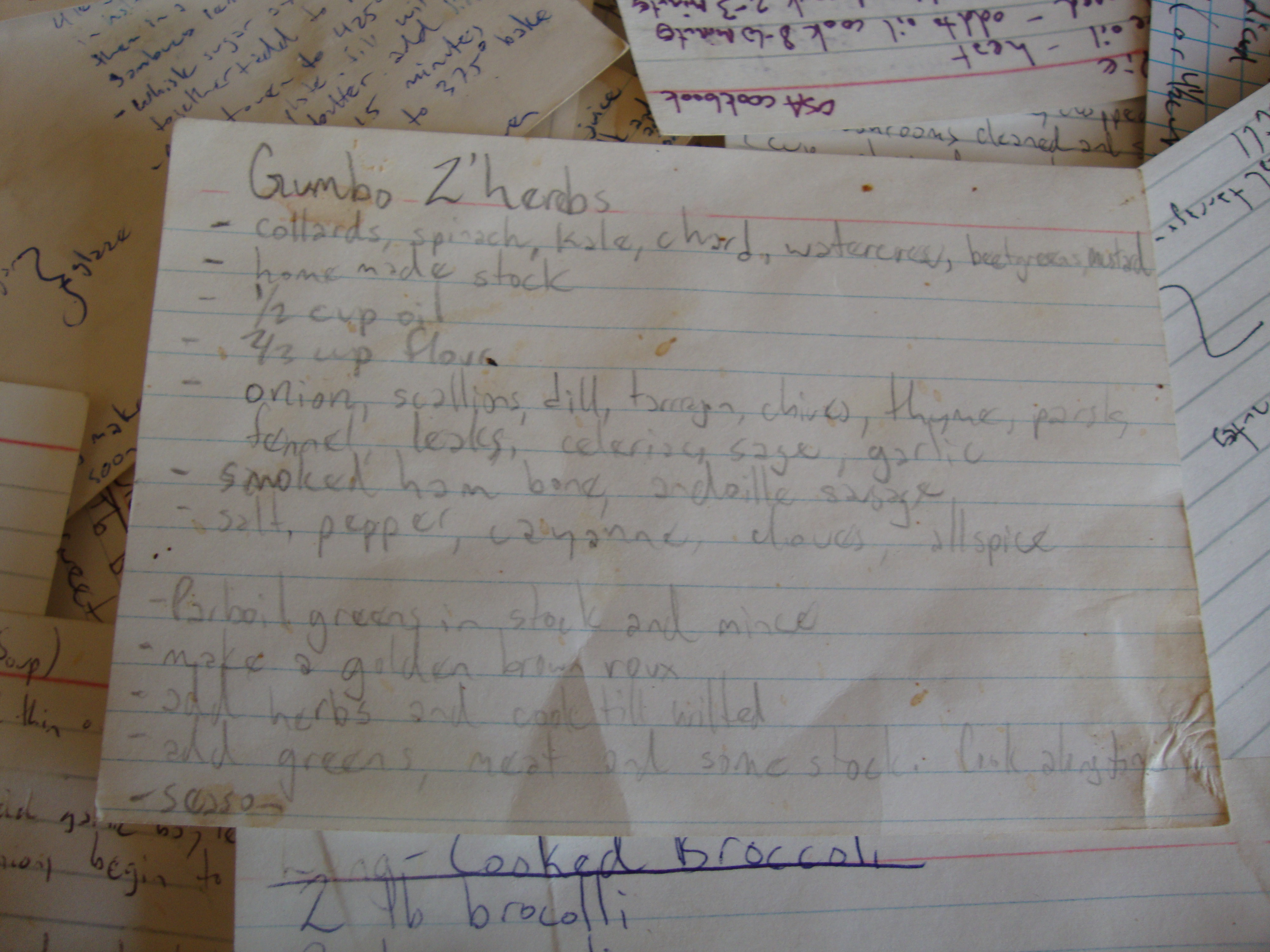 I got this gumbo recipe from an old copy of The American Heritage Cookbook.  Gumbo Z’herbs is an old creole recipe for Lent, when you are not allowed to eat meat.  However this recipe includes meat stock and sausage or smoked ham bone for flavouring, so that is confusing to me…..  Maybe this is only a distant relative of the original.  I like this recipe because it embraces ANY kind of leafy greens or herbs that you may have on hand.  Those of you from Vancouver, stop snickering you know that I am talking about official, legal vegetables.  It’s a good way to use up radish tops, fennel or leek greens and other vegetable trimmings that most recipes don’t call for.  The original recipe is not very detailed (it assumes that you know how to make a roux).  I will include more detailed directions.  I do not recommend making this recipe in a non-stick pot (I do not recommend non stick pans in general).  You have to be able to scape the bottom of the pot without fear of scraping bits of coating into your food.