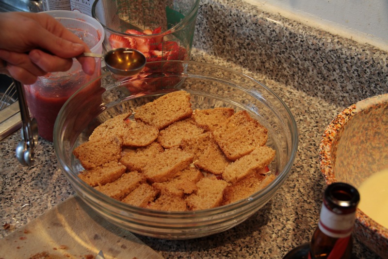 I recently bought fresh strawberries and rhubarb at the farmers market. I had intended to make a gluten-free strawberry rhubarb pie. I didn’t feel like following a recipe… I just decided to cook the strawberries and rhubarb down with a bit of sugar and dry ginger powder to make a pie filling. The result was delicious but not at all right for a pie filling. My fiance Chris was content to stand at the counter and eat the compote by the spoonful…but it was not pie filling. I decided that it would be good in trifle, which I have not had the pleasure of eating since I stopped eating gluten about 5 years ago. So here is my recipe for gluten-free strawberry rhubarb trifle!