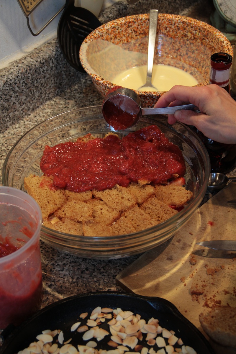 Trifle is a thing of beauty. It is boozy cake, layered like a parfait with fruit preserves, custard, whipped cream and nuts. It looks gorgeous and tastes amazing. A trifle is an excellent desert make ahead of time when you need to feed a lot of people. It is a British desert (I’ll say it again….I love british food). There is a lot of room for creativity with trifle. My Aunty Mona used to make a Mexican Trifle that had used home-grown and homemade apricot preserves, toasted almonds and a dusting of dark chocolate shavings on top. I’m not sure why it was called Mexican Trifle (maybe the cake was soaked in Kahlua?) It was soooooo good. For Christmas once, I made a trifle that used cranberry preserves and a ginger chocolate pudding. It was not bad at all. Where I grew up in Canada, colorful jello was frequently a trifle layer. I think that putting jello in your trifle is gross now, but I have to admit not minding it all as child.