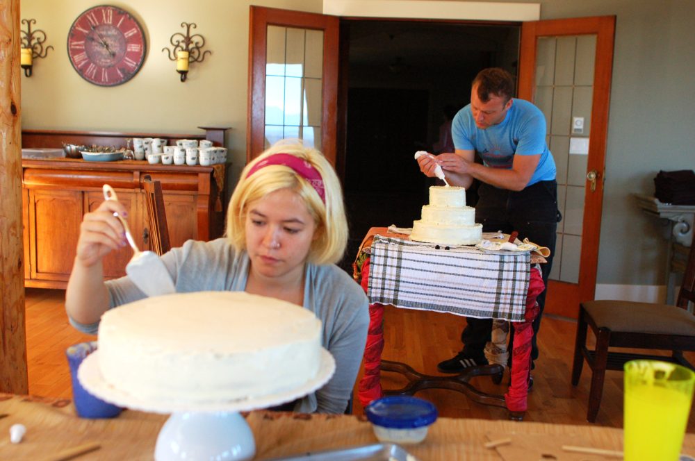 I came up with a gluten-free wedding cake recipe. My mother and aunties spent 12 hours baking the cake. Our friends picked blackberries for the cake and decorated it.