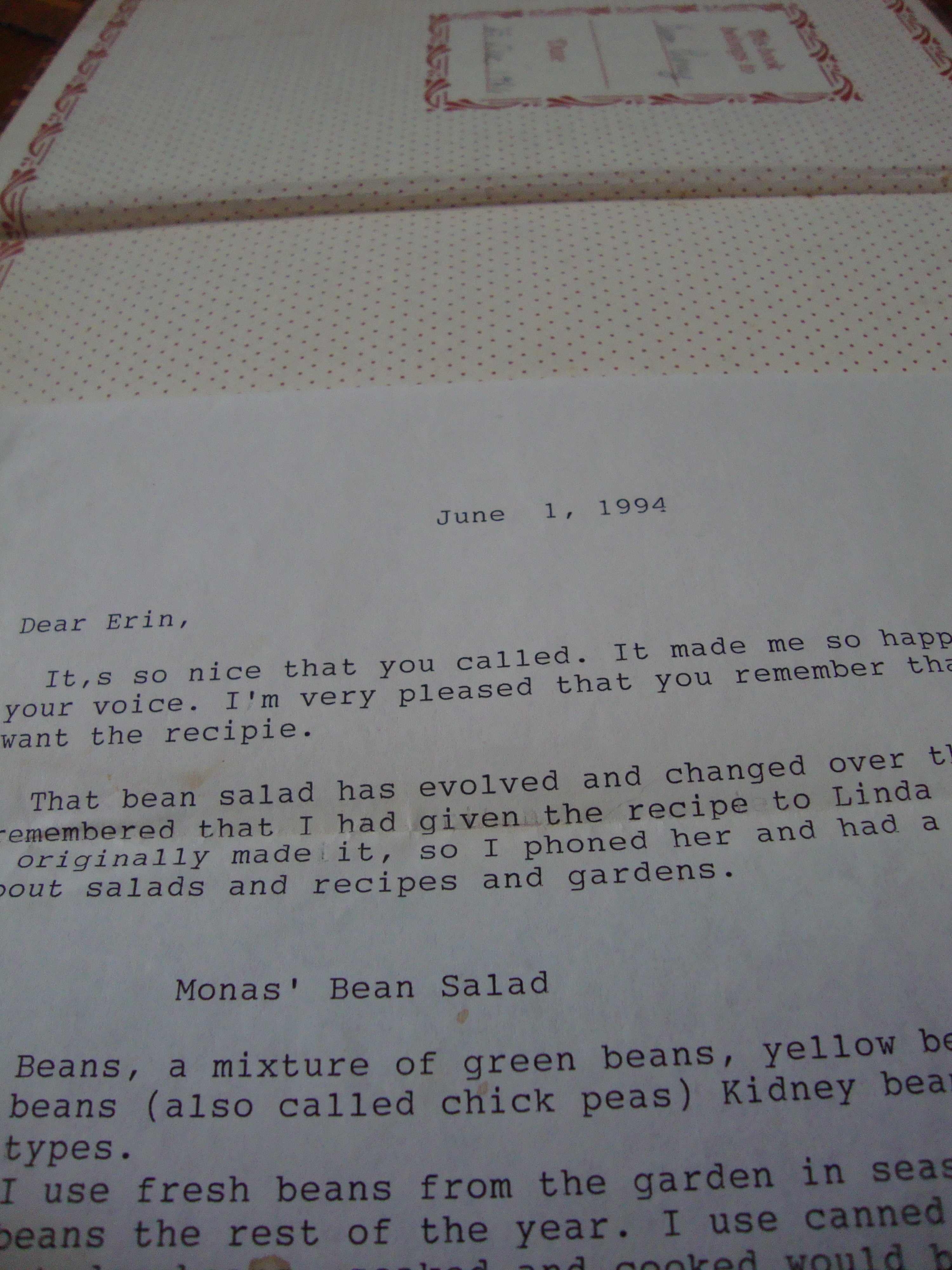 On the inside cover of my first notebook, I stapled a letter from my Aunty Mona regarding her bean salad recipe. I had called her, long distance, to ask her for the recipe during my second year of college. I had not had it since I was a little girl and I craved it. She typed and mailed me a letter with the recipe. Somewhere, I have other letters from Mona which provided me with some of my best cake recipes and instructions on how to cook meat. For those of you who do not personally know me…cake baking and meat cookery are pretty much my culinary super powers and they both come from Mona. Writing this blog is so satisfying to me because I get to write you all a letter, with a story and some advice, like Mona did. Its more fun than just copying the ingredients out over and over again.