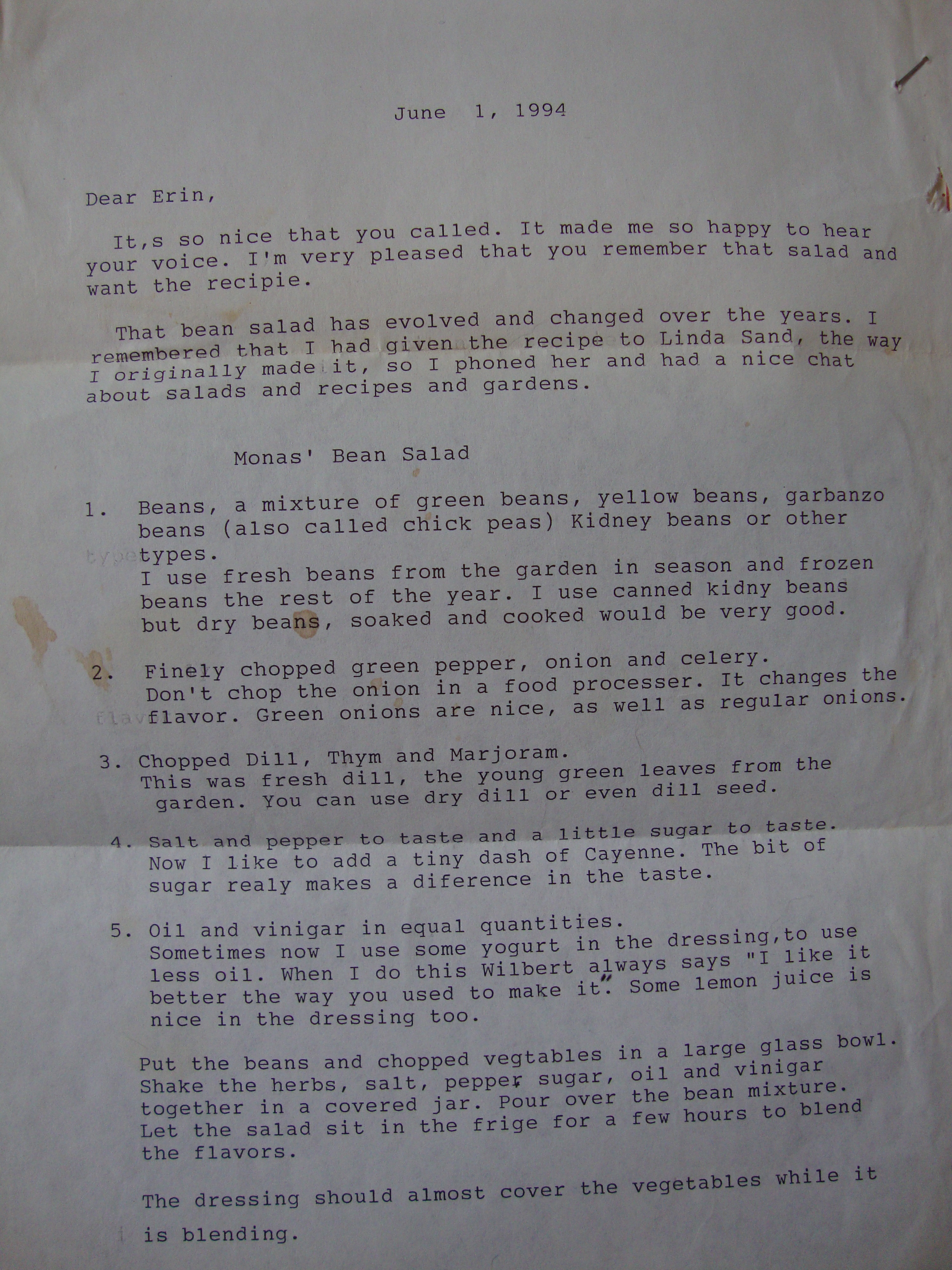 I included Mona’s bean salad in the wedding picnic menu because it is the BEST side dish for summer food..anything to do with corn or tomatoes or salmon. If you want to be a very happy person try Mona’s bean salad with Tomato Pie. Also, I like this salad best after it has been siting around for a few days (the beans and onions sort of pickle) and I was trying to find food that could be made in advance so that the wedding day would be relaxed. This is one of the dishes that many of the wedding guests asked me for so here it is! I still make this salad exactly as it is written in the letter below except that I use raspberry vinegar (I agree with my Uncle Wilbert..no yogurt).