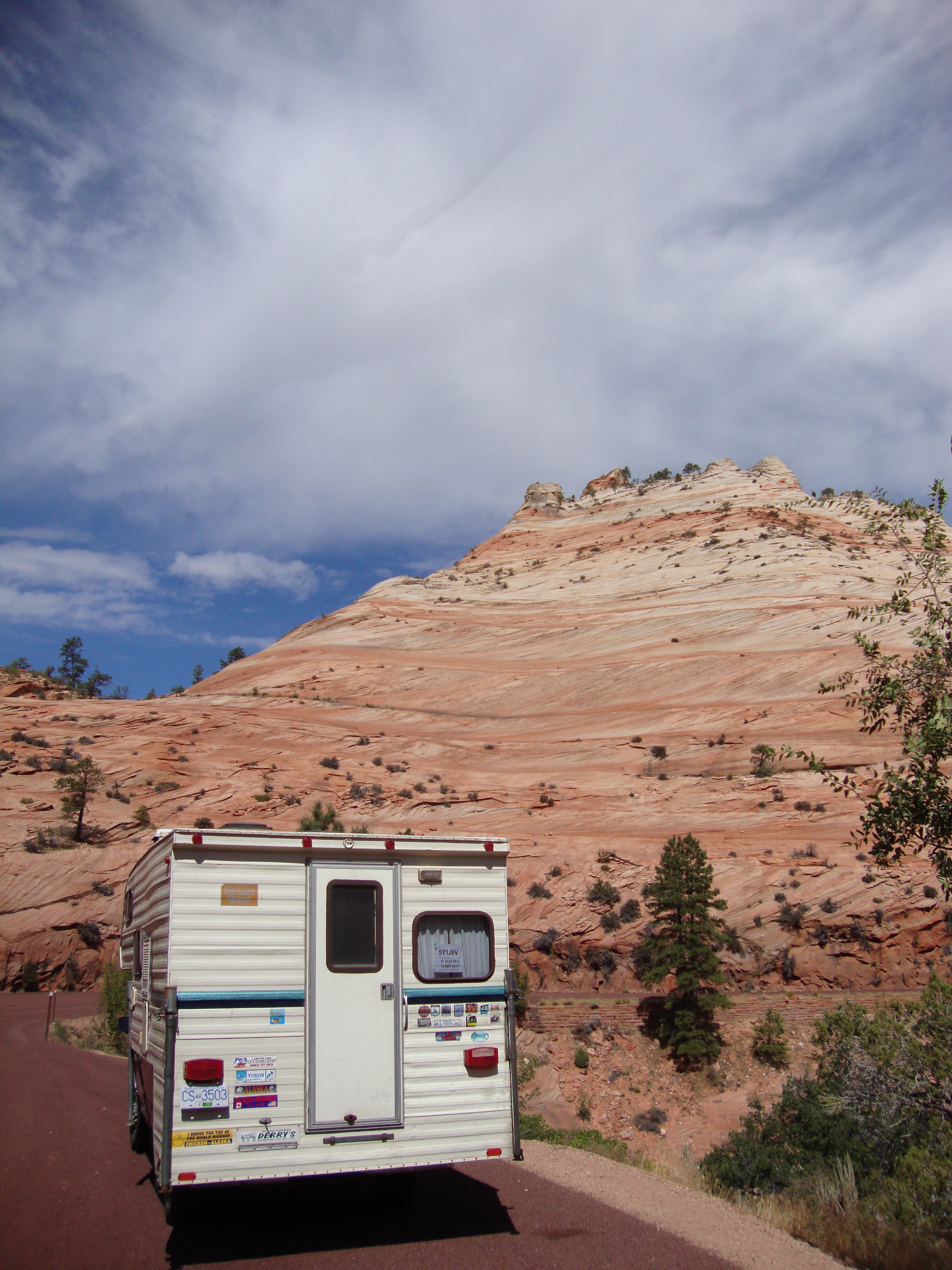 That is the Checkerboard Mesa in Zion National Park. The horizontal lines were formed when the sediment was piling up and the vertical lines are from erosion. Neat huh? We ate our jicama slaw while looking at the Checkerboard Mesa.