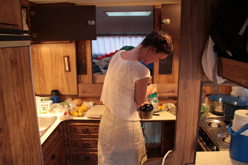 Traveling and cooking are two things are right up there with black tea, hot baths and my cats on the list of things that are key to my happiness. I delight in trying out local produce and delicacies where ever I go. However, actually cooking on the road is usually quite tricky….unless you have a camper. Our camper is very small, but efficiently designed. It has a kitchen sink, good cupboard and counter space, a fridge, four gas burners and a gas oven. This is my ideal way to travel.