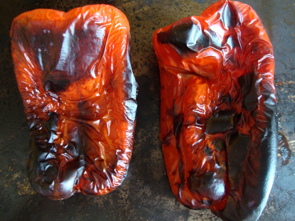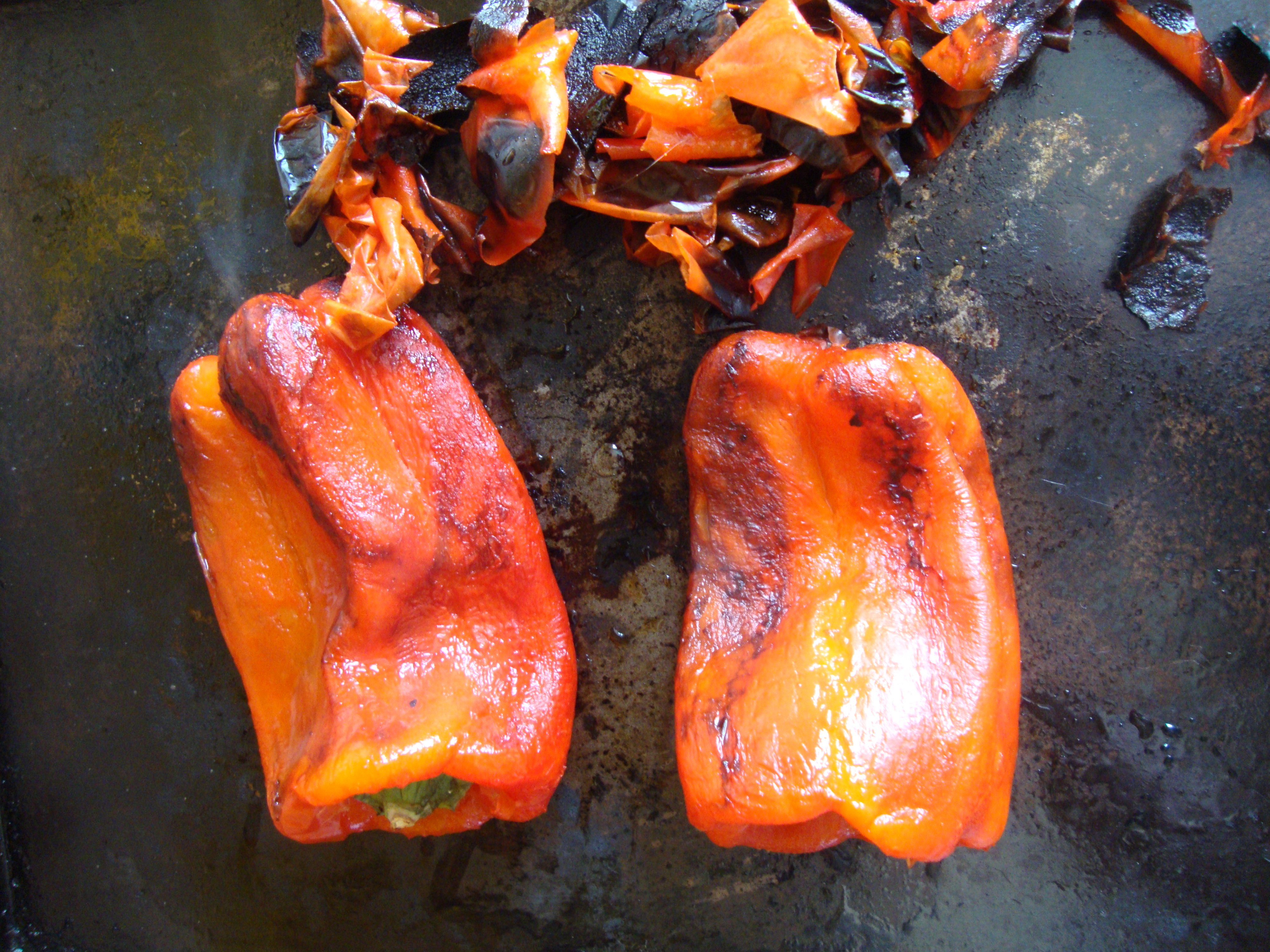 1. Place three to five whole red peppers on roasting or cookie sheet.  Place them under a hot broiler and set the timer for five minutes.