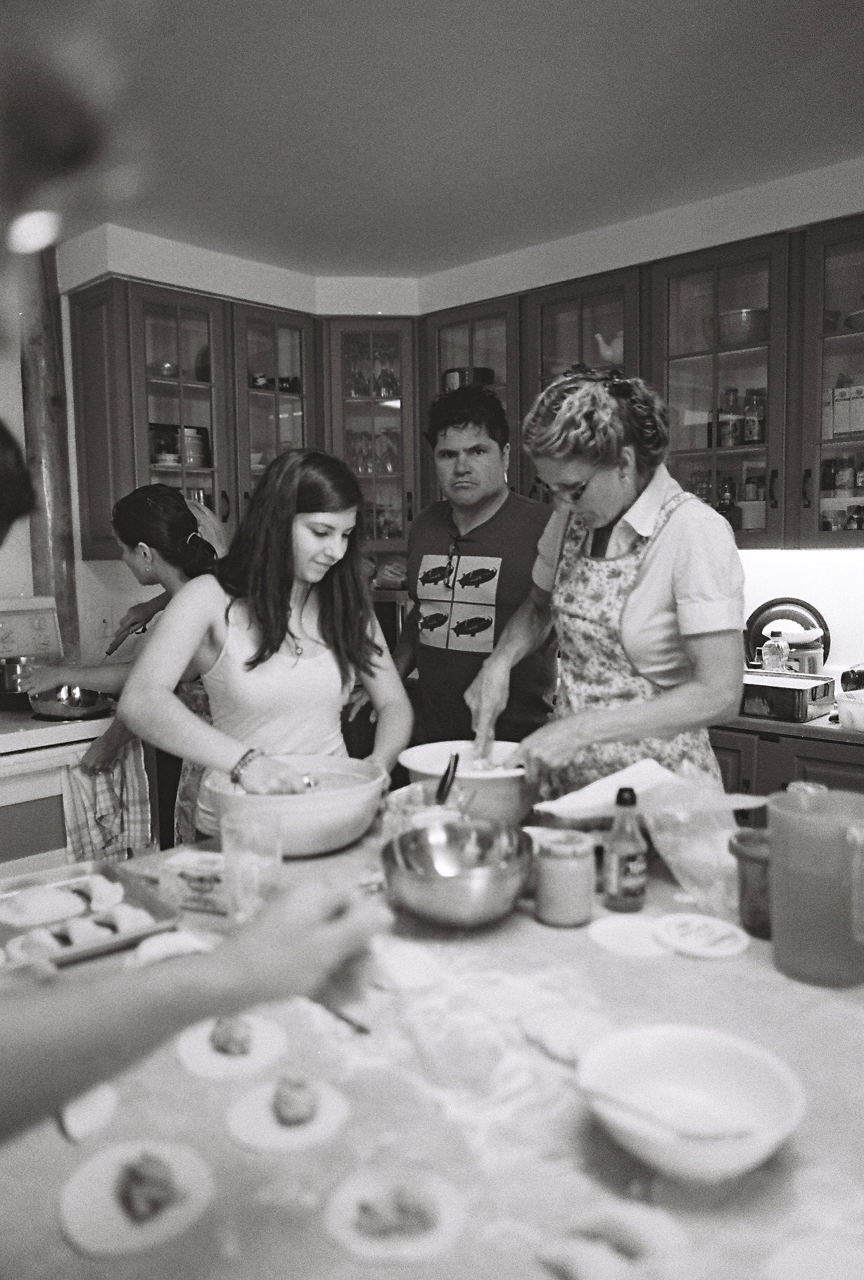 Baked SamosasSamosas are really supposed to be deep-fried and they are also supposed to be in a little triangular pouch.  My version is baked and they are in a half circle (like an empanada), but they are still delicious.  Baked samosas stay yummy for a few days where as anything deep-fried needs to be eaten right away.  You can fill these samosas with turkey keemaspiced cabbage with fennel seeds or the a spicy potato mixture (recipe below).  We made potato samosas for our Indian buffet wedding welcome dinner….or rather our friends made them for us.  There were some fabulous pastry chefs in attendance and one family friend who gave excellent tutorials anyone who hadn’t done it before.Two generations of baking talent