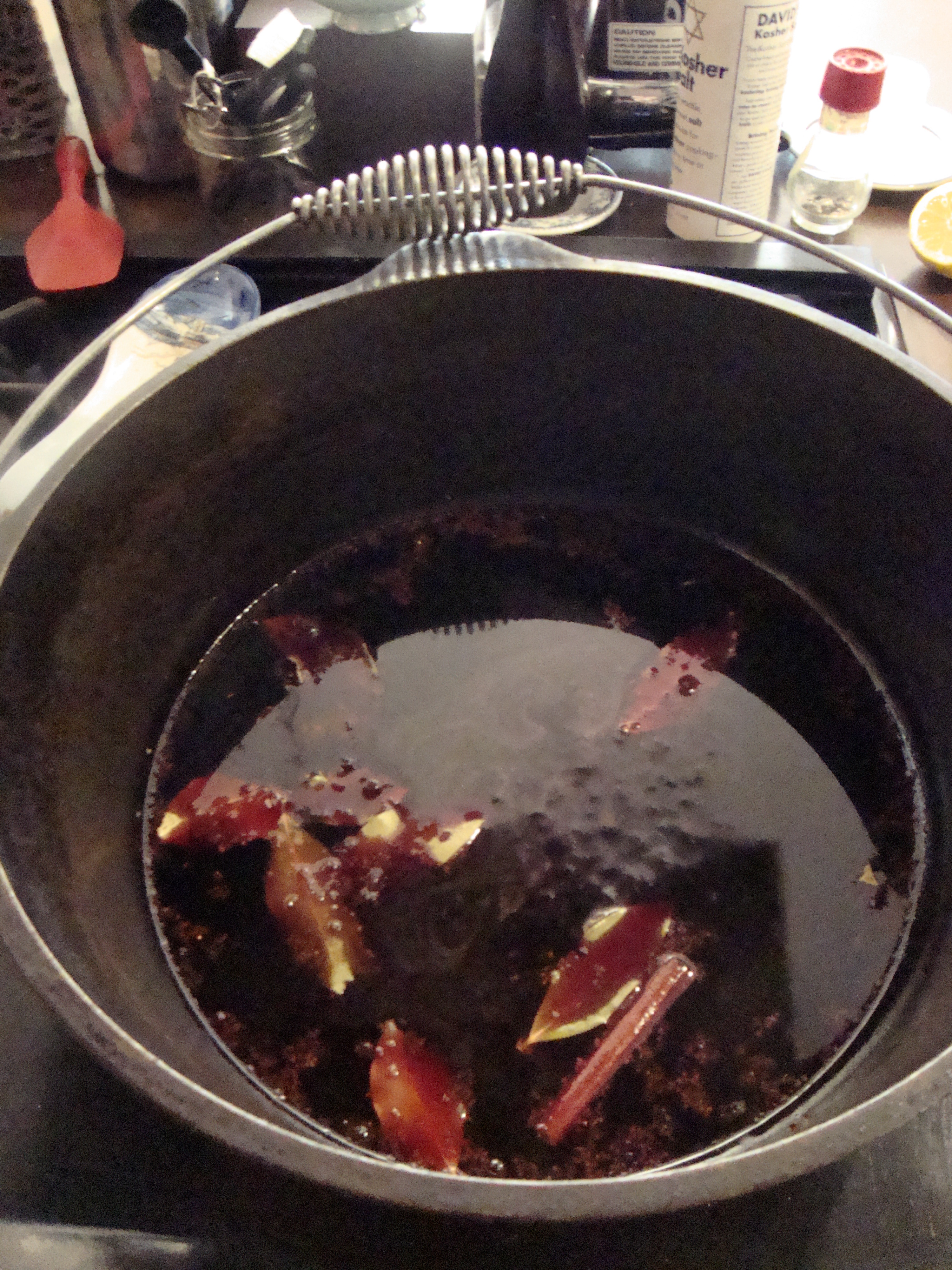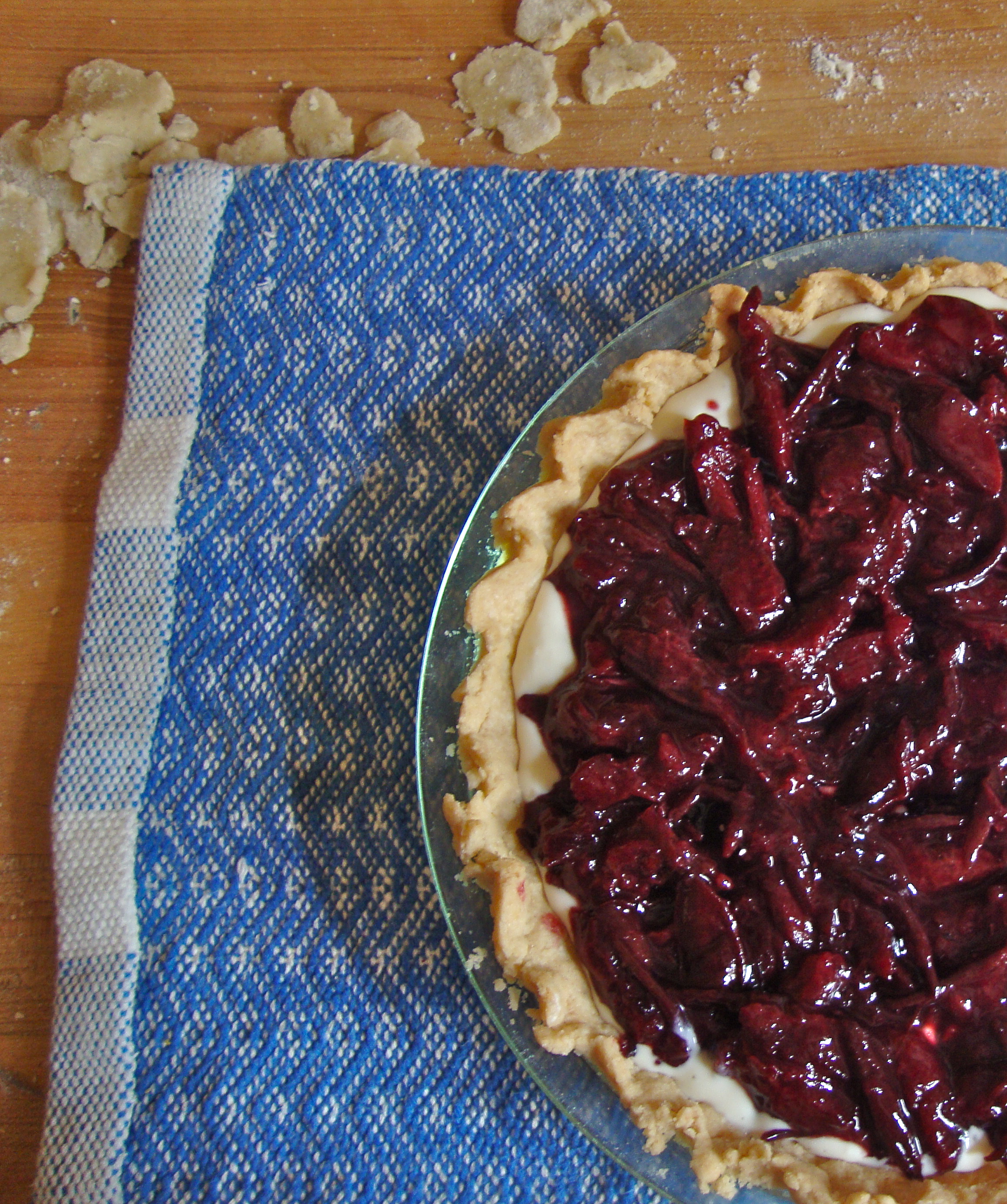 I took all of the ingredients overt to my friend Sarah’s house and we spent a very leisurely afternoon stewing the plums in spiced wine and baking a crust. Sarah has a HUGE kitchen with two sinks and every kind of kitchen tool imaginable! Most people in Brooklyn cook in kitchens the size of a boat galley. I think I was moving slow in Sarah’s kitchen just because it was so nice to be there!