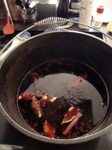 - 2 cups Barolo or Zinfandel (the local wine shop recommended a wine made with the same grapes as Barolo that did not cost fifty dollars a bottle and it worked out just fine)