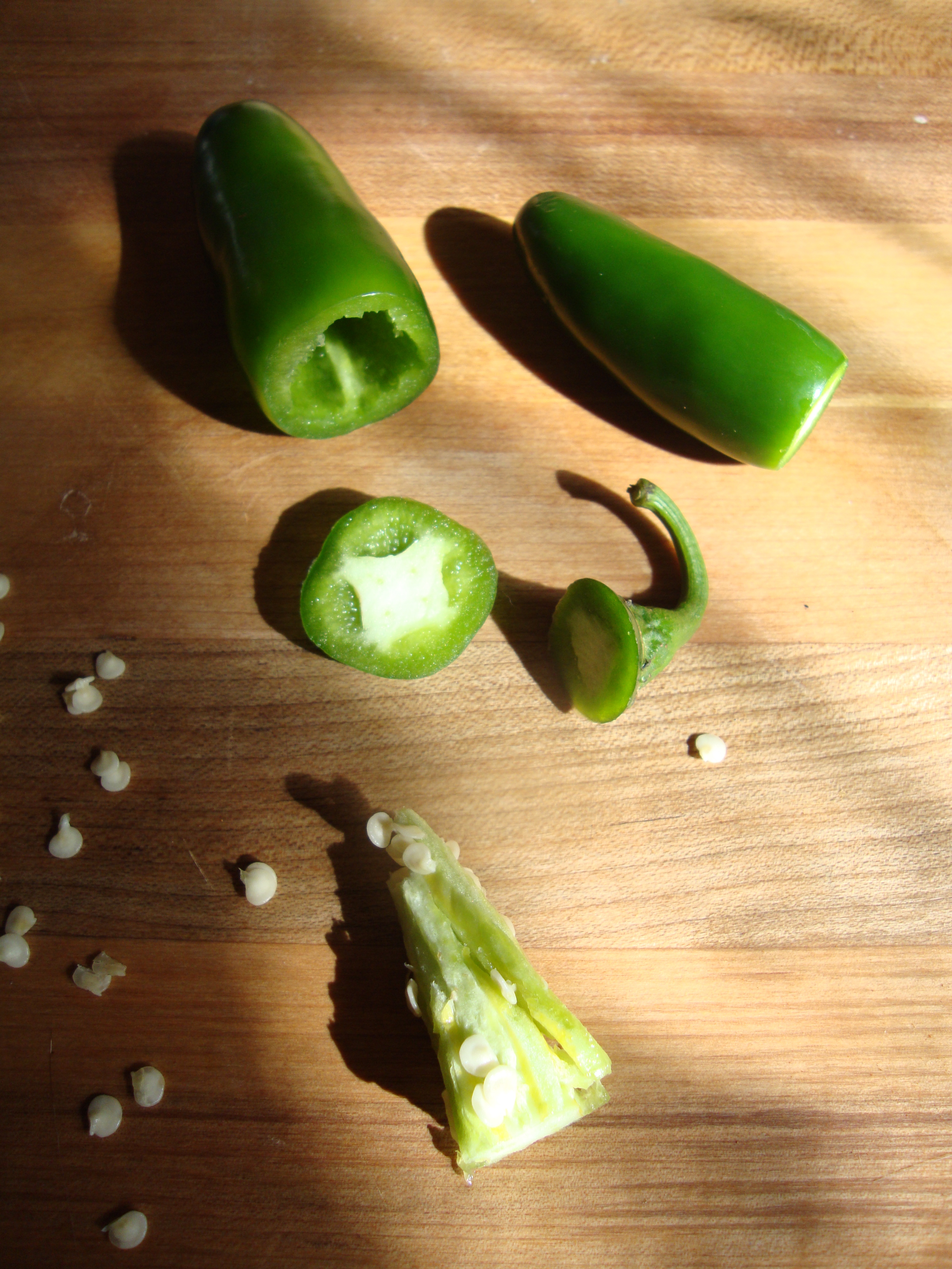 - Cut the stems of off each of the peppers and use a small serrated knife to scape the seeds and core out of the peppers. A tomato knife works really well if you have one.