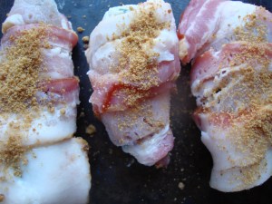 Now, this girl grew up on a ranch in Texas, so she had more access to barbecuing than I do. However, I remembered that one long ago Thanksgiving my friend Larisa brought water chestnuts which she had wrapped in bacon and sprinkled with sugar, and baked them in my oven. The resulting treat is so good…I have to put it out of my mind or I will start making it as a regular snack for myself….Sorry I got distracted…the point is that I knew that I could reproduce the bacon wrapped jalepeno popper at home using Larisa’s technique!
