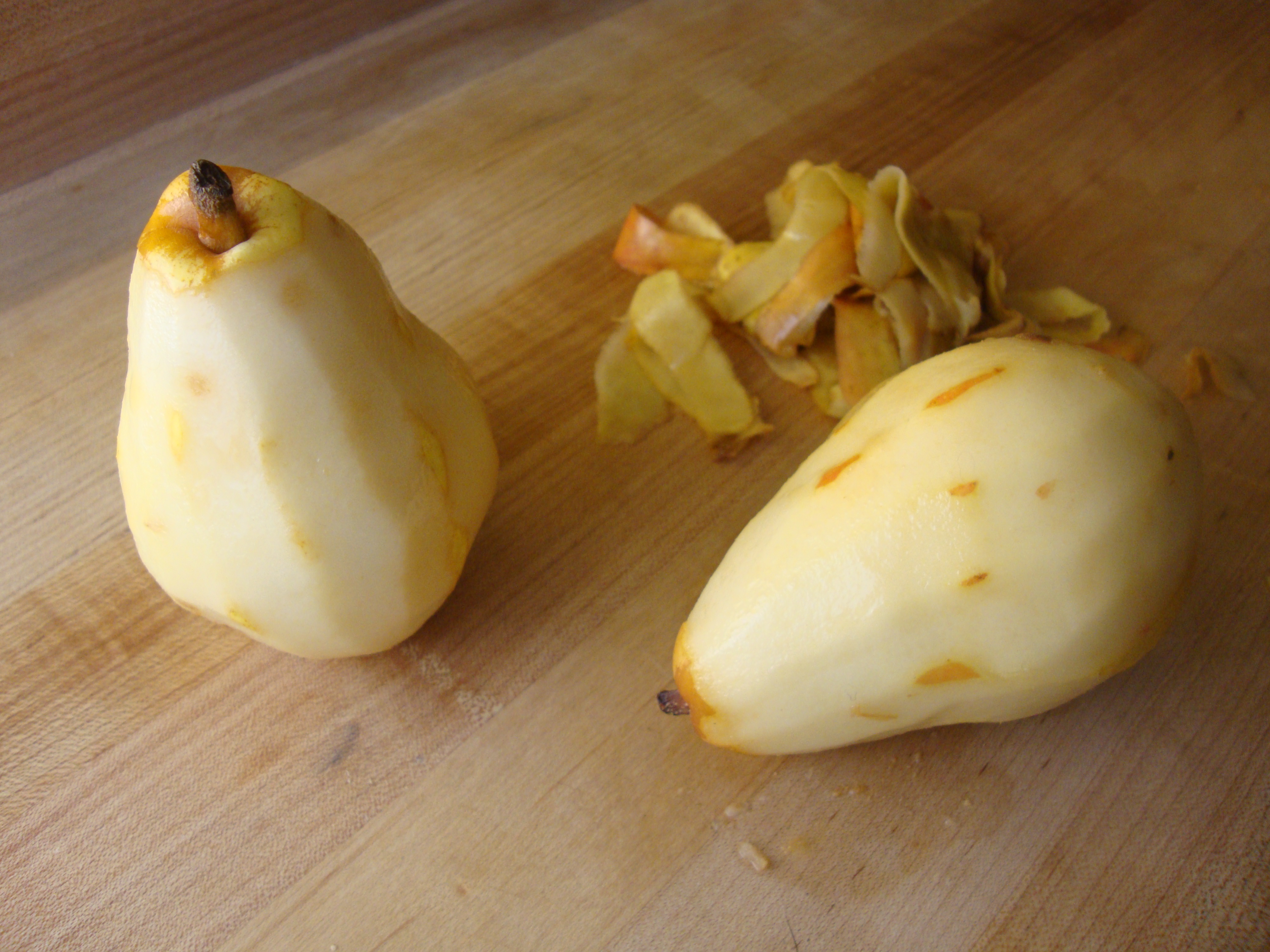 - Bring the wine, juice, orange zest and sugar to a gradual boil in another heavy saucepan. Meanwhile peel the pears, halve them, cut out their stems and remove their seeds with a round metal teaspoon.
