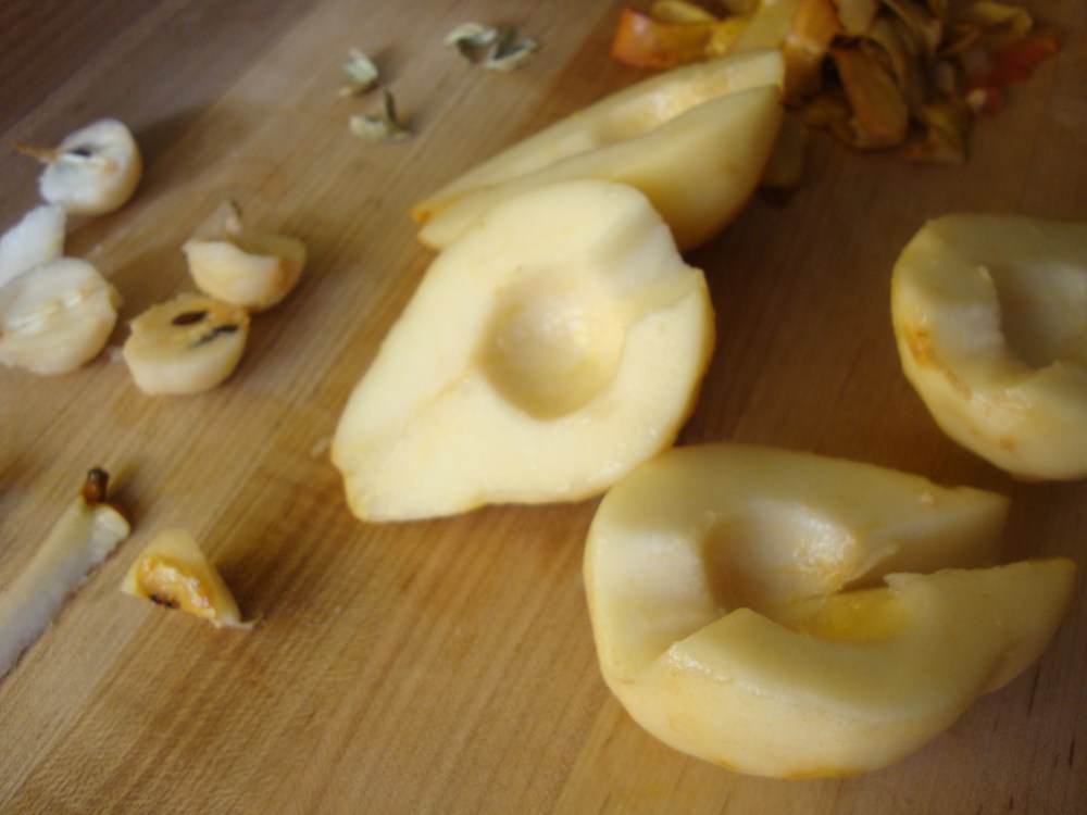Chris brought me some tiny adorable pears from the Adirondacks. I had an apple that was bruised and beginning to rot. I also had a half full bottle of white wine and an orange. We had guests coming over for dinner. I made this tart. I got the poached pear recipe from Vegetarian Cooking for Everyone by Deborah Madison. I made the cardamom apple butter up…you might know a better way to do it.