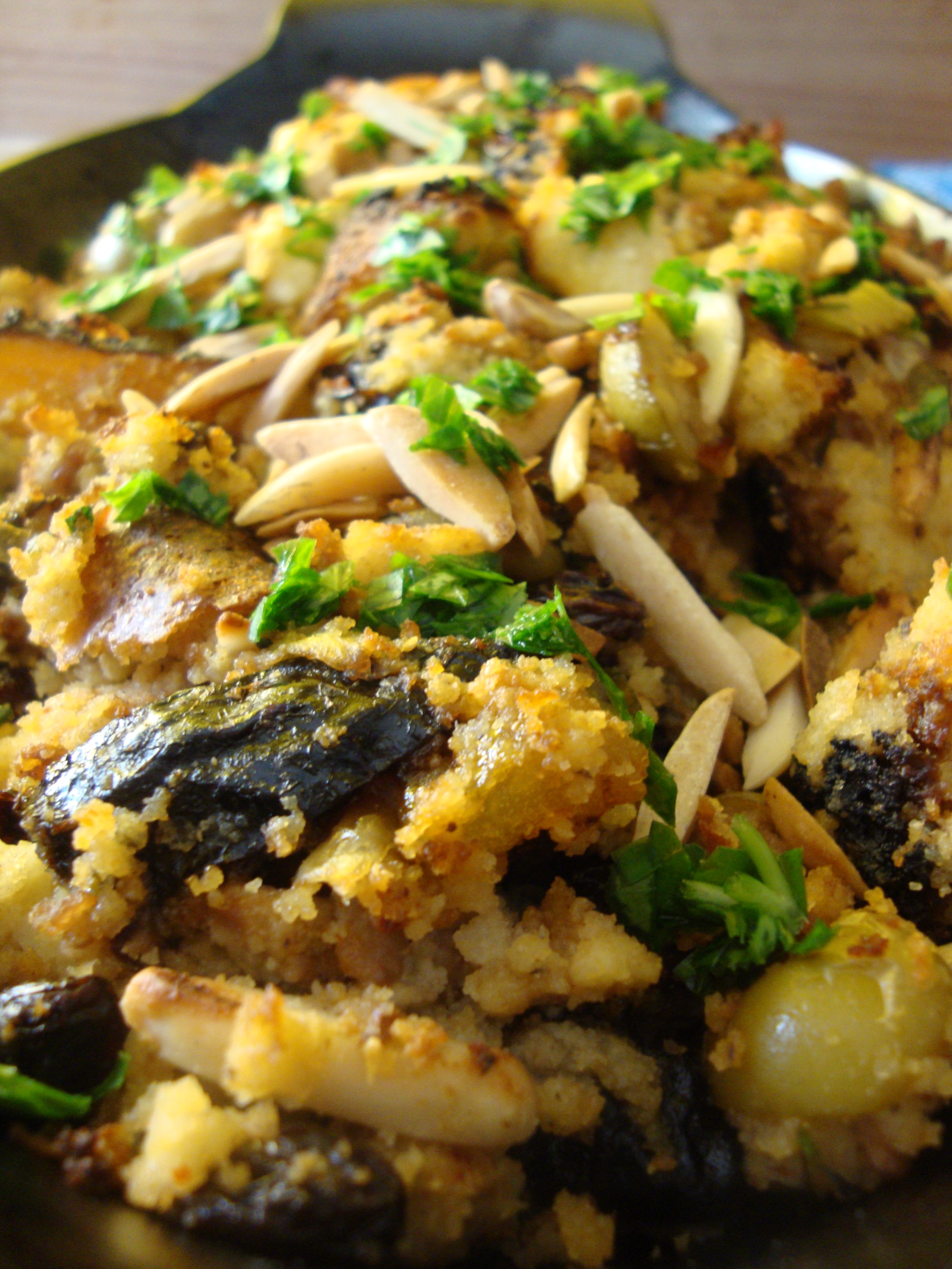 Moving on to things that I have actually tried…I recently made a disappointing stuffed pork loin recipe. Although I was not happy with the dish itself, I did make a really good yam, swiss chard and chipotle gratin out of the leftover seasoning paste. I was also left with TONS of this delicious fruit, almond and green olive stuffing. I mixed it with home-made cornbread and used it to dress a baked chicken, and to quote José, it was beautiful. It would be a good stuffing for a Thanksgiving turkey too…although I like to bake my turkeys unstuffed…I just bake the dressing on the side.