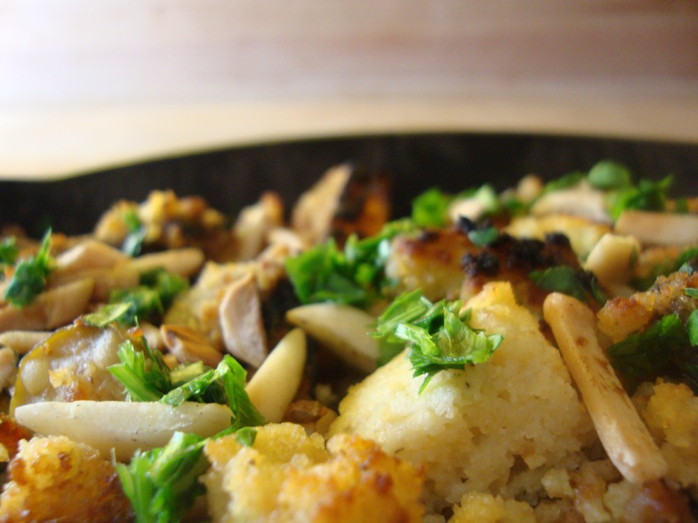 - Crumble the cornbread leaving some large chunks and combine it with the fruit, almonds and parsley.