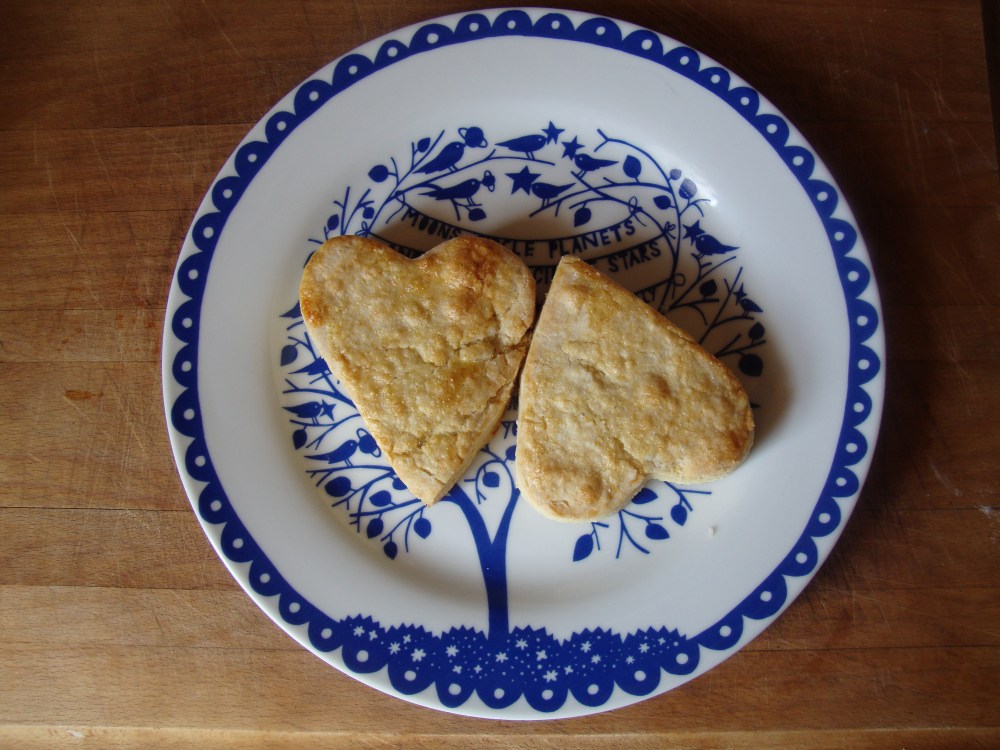 I used to make my biscuits by dropping them on to the sheet instead of rolling them out and cutting them. They always turned out fluffier that way. This recipe calls for rolling and cutting, but specifies that you should not use a glass but a sharp cookie cutter to cut out your biscuits since any pressure from a dull edge with compress the dough and make them less fluffy. I have not tried these gluten-free biscuits in the drop style yet, but the advice about using a cutter instead of a glass produced lovely biscuits. Now I just need a cookie cutter that isn’t heart-shaped!