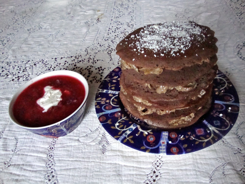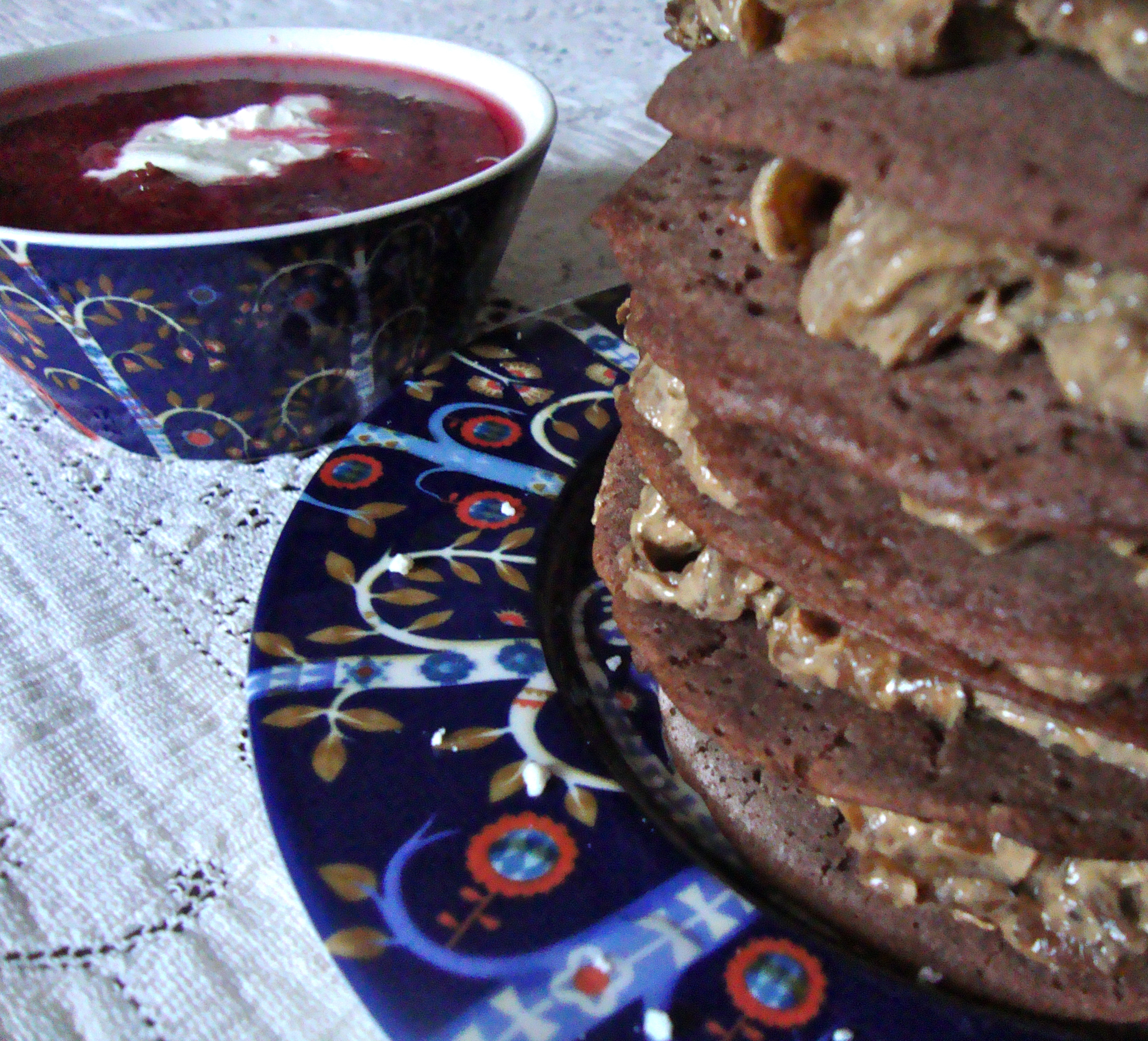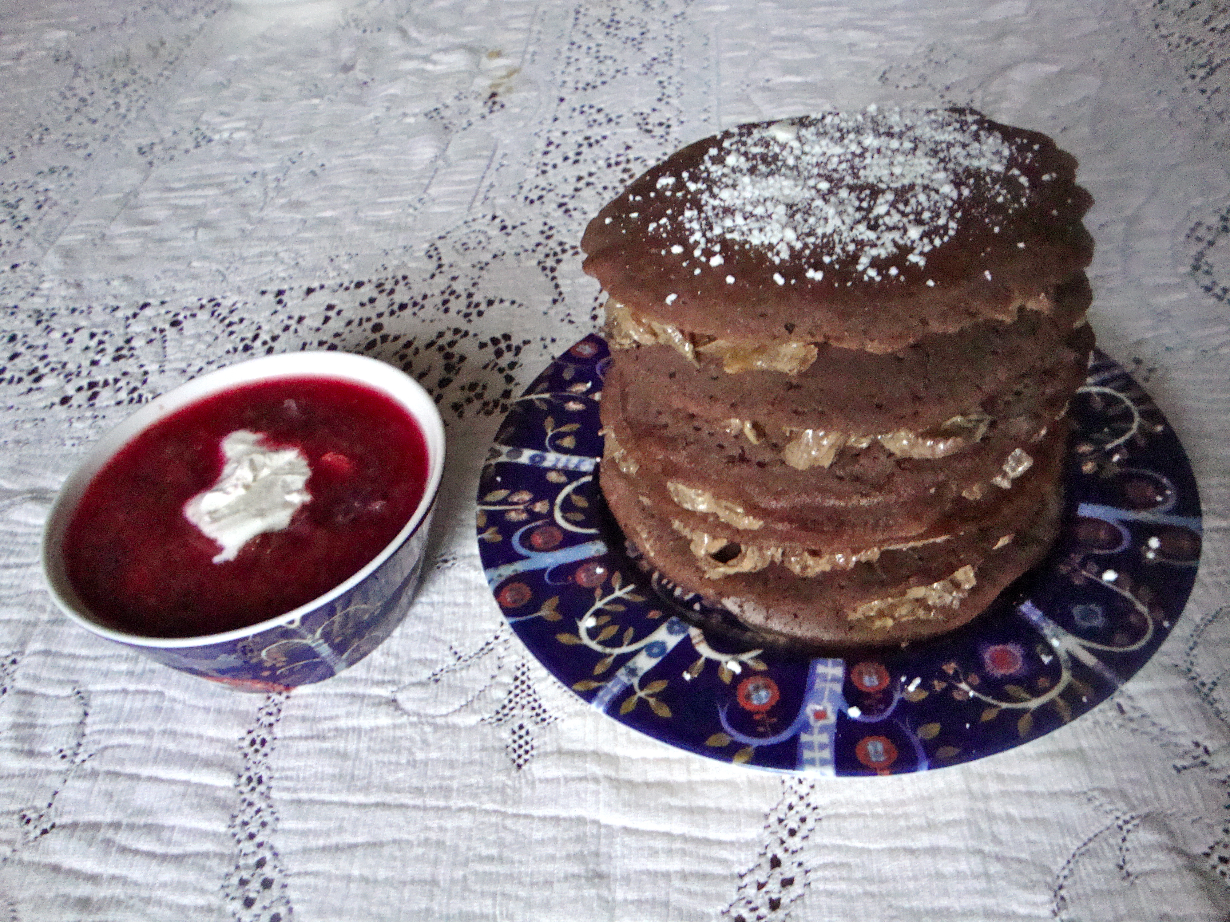 I made Ethiopian bread recently that turned out more like a blini and it made me want to recreate the House of Blini mushroom blini casserole.  What I have made is more of an homage than an exact recreation.  I am reasonably feminine and glamourous….but I am not wearing a glittering ball gown as I write this.  I don’t even know if this is a casserole…maybe its more of a savory layer cake or a savory blini and mushroom blintz…but I do know that it is delicious and I also know that you should serve it with Hot Borcht!