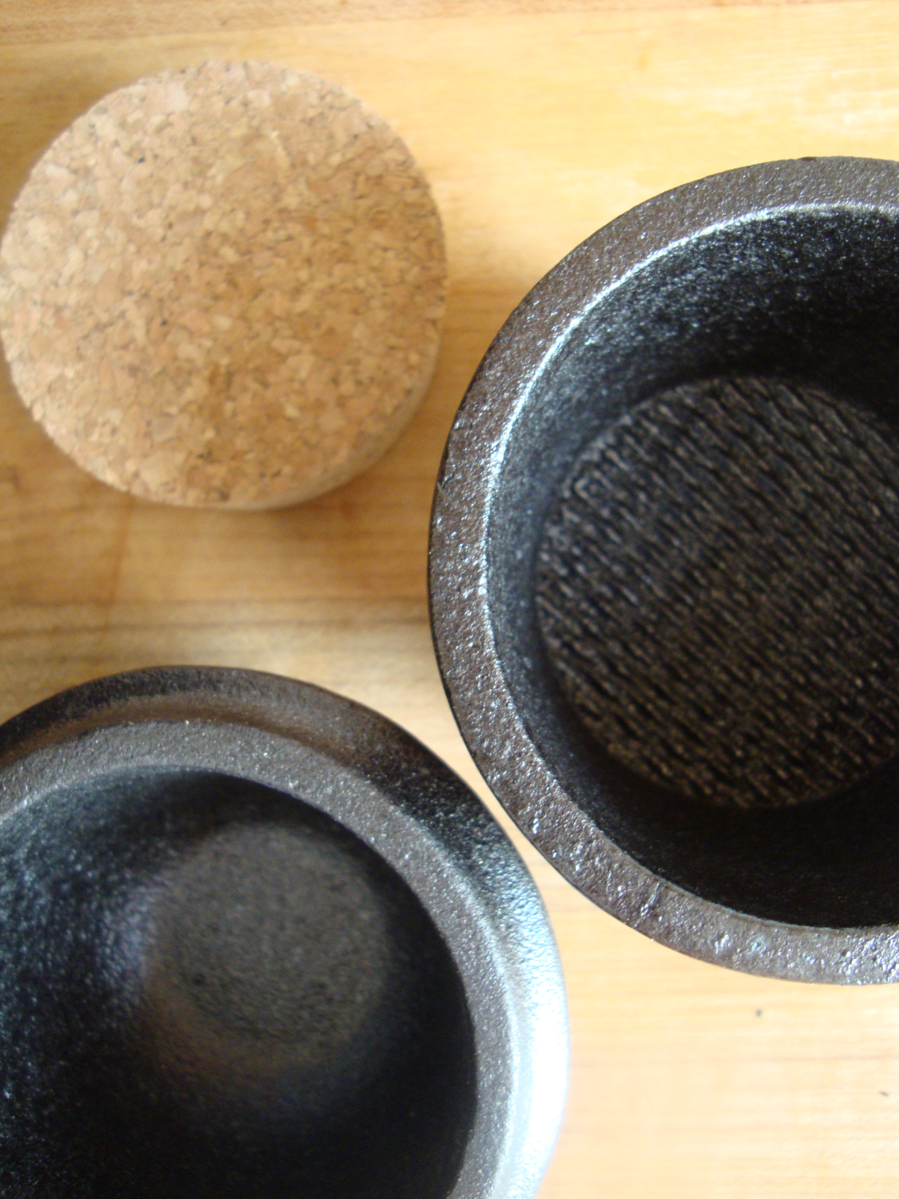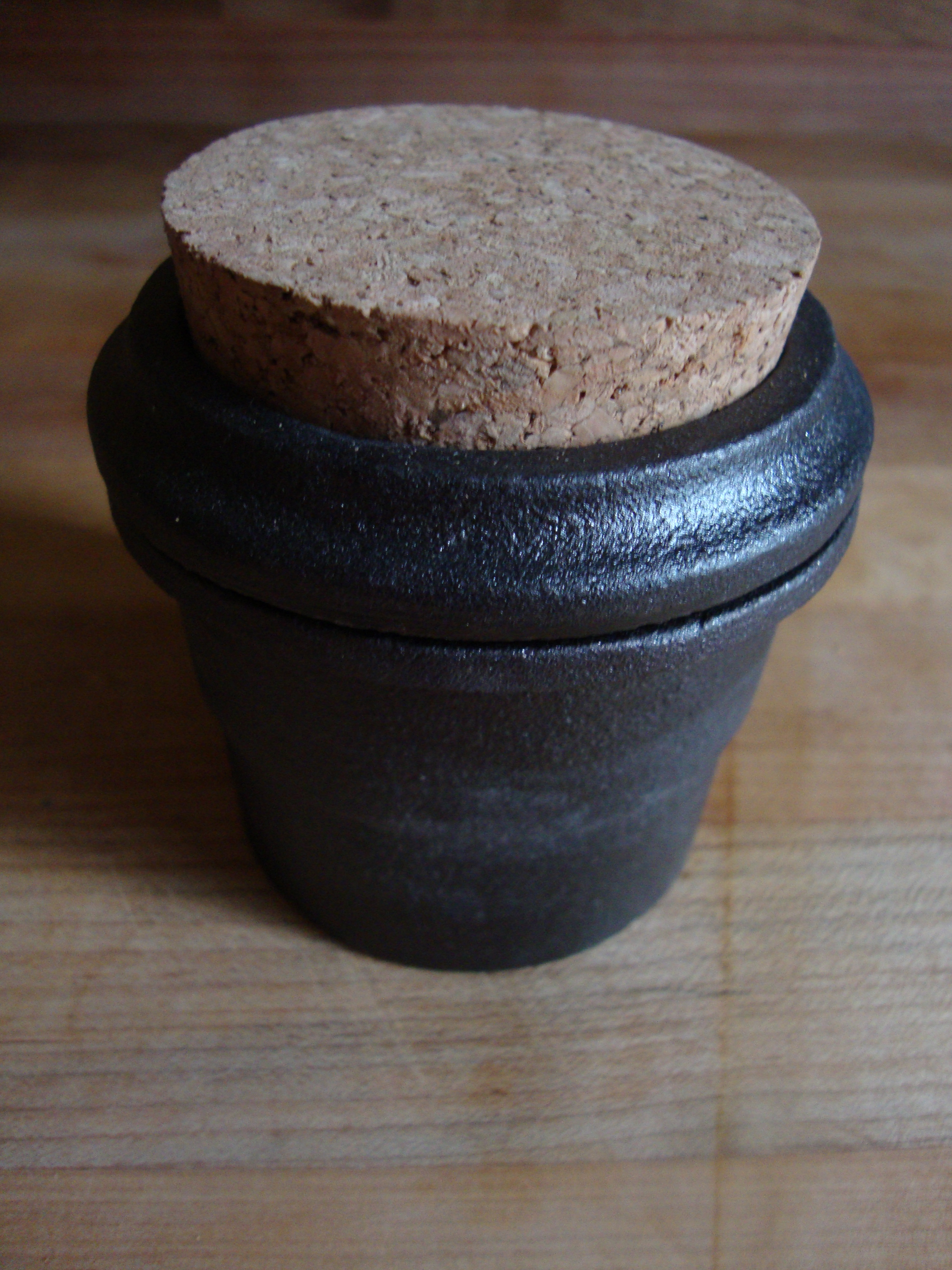 Cast Iron spice grinder from Canoe. The spices go in the bottom chamber. The smaller chamber sets inside the bottom one and is twisted to grind the spices. You can store your ground spices in the smaller chamber. The cork lid keeps them fresh! Your spices will be infused with iron, which is good for you!