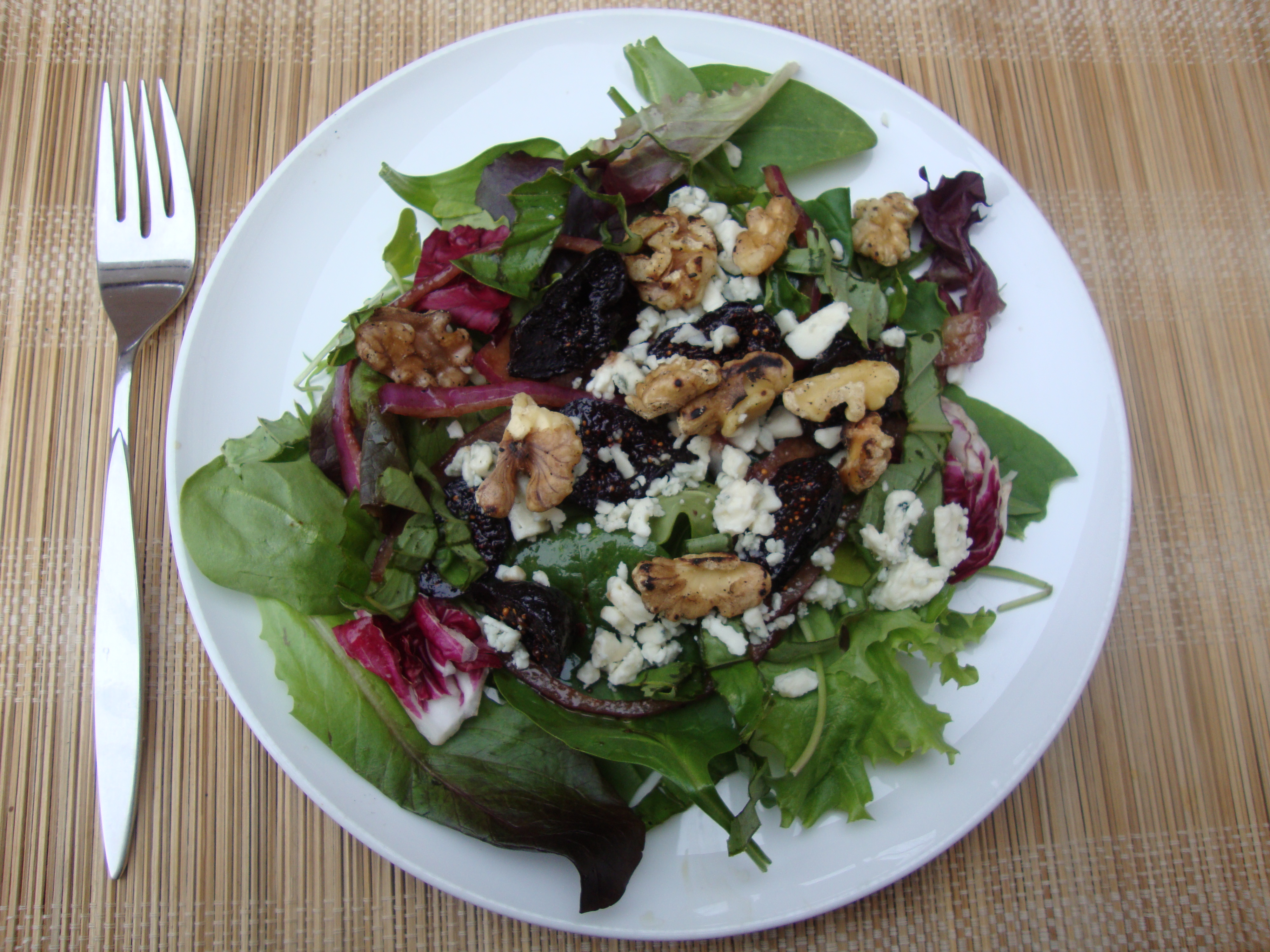 CHRISTMAS SALAD WITH FIGS MARINATED IN SPICED WINE, BLUE CHEESE AND TOASTED WALNUTS