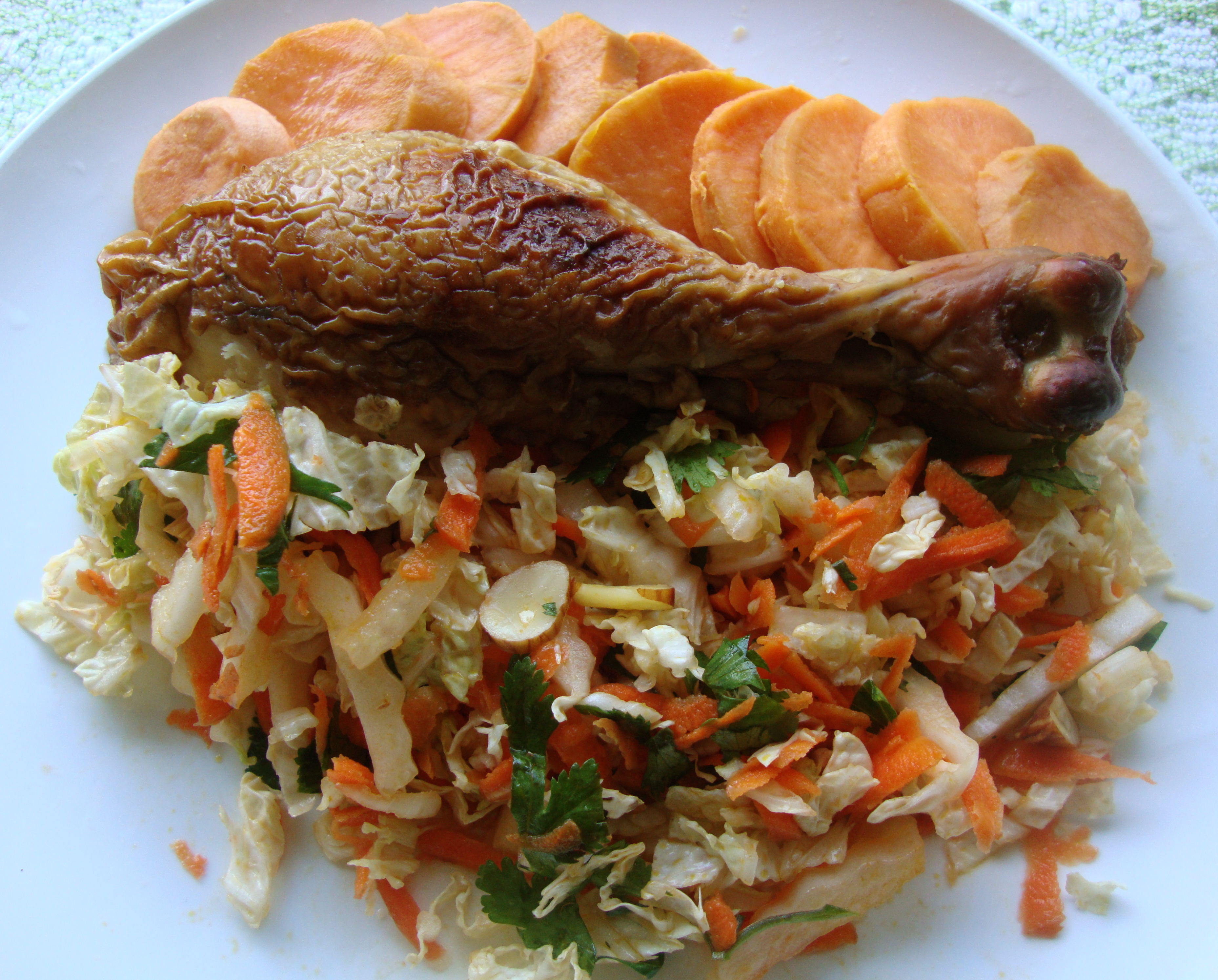 6. Serve the chicken with the gravy, baked yams and my mother’s asian slaw.  Leftovers are good eaten cold with asian slaw