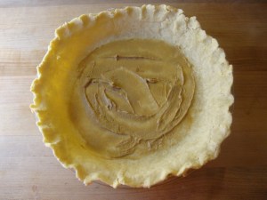 - Prepare and pre-bake the gluten-free crust (recipe below). If using store bought pie crust, press it onto the bottom and up the sides of a 9-inch diameter tart pan with removable bottom. Line crust with foil, fill with pie weights and bake 20 minutes at 350. Remove foil and weights then bake until crust is golden, about 5 additionally minutes. Press crust back with the back of a fork if bubbles form. Cool crust.