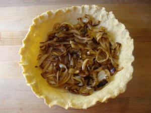 - While the crust pre-bakes, heat remaining 1 1/2 tablespoon olive oil in a heavy large skillet over medium-low heat. Add onion, sprinkle with salt and pepper and cook until onion is a deep golden brown, stirring occasionally (30-40 minutes).
