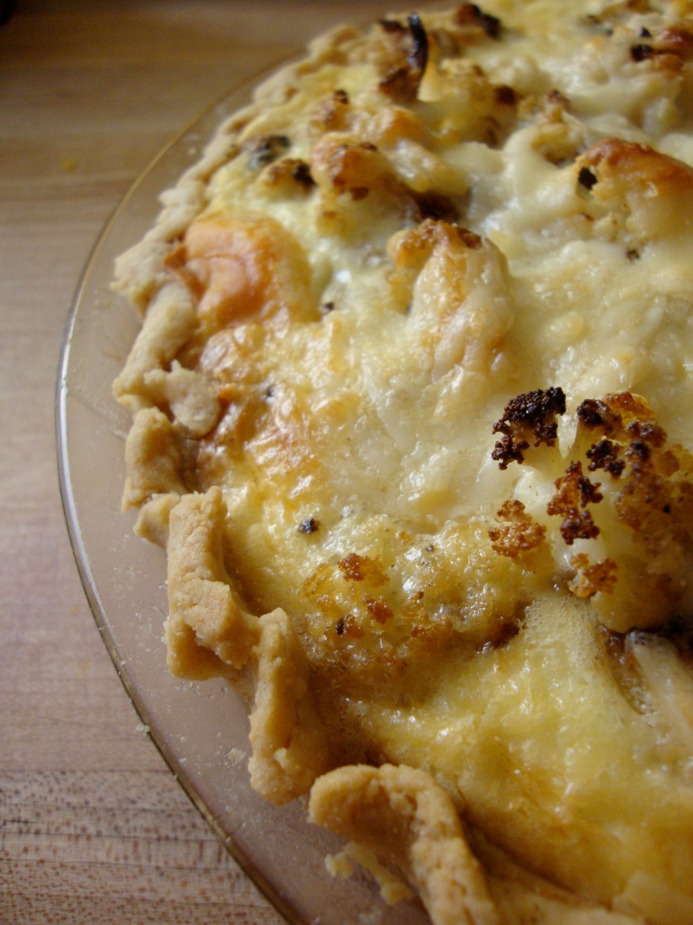 - When the crust is pre-baked, adjust the heat to 350 degrees. Use a knife or brush to spread the bottom and sides of crust with mustard. Spread onion over crust. Arrange cauliflower over the onion. Set the tart on a rimmed baking sheet (to protect against leaks). Whisk eggs, mascarpone, cream and pepper in a medium bowl. Stir in Gruyère. Pour mixture over filling in tart pan, sprinkle with Parmesan. Bake until tart is golden and center is set, about 40 minutes. Transfer to rack and cool 15 minutes before serving.