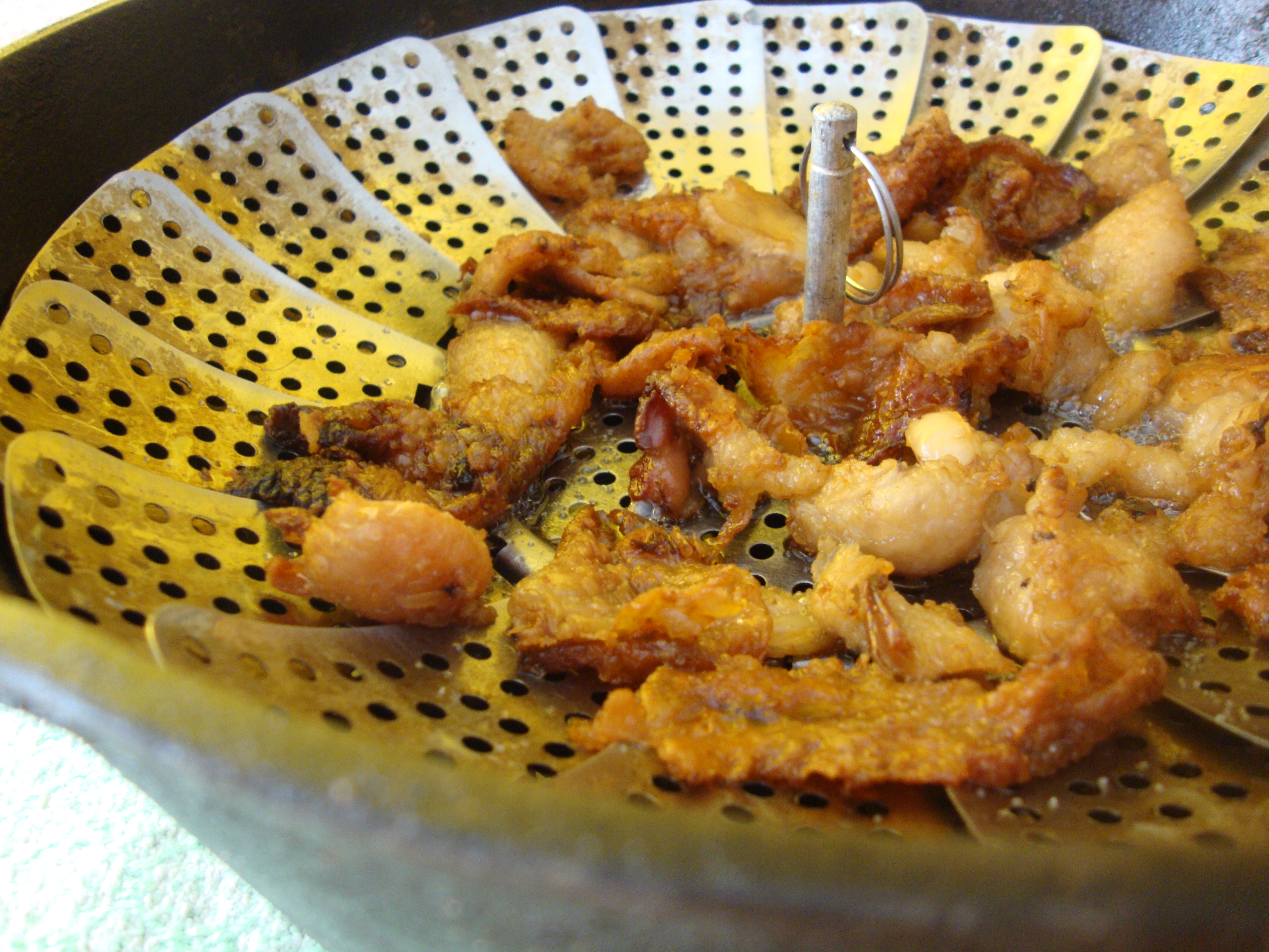 There is one more thing…Your duck will still have thick layers of un-rendered fat just under its crispy skin.  I like to put all of these slabs of fat in a metal vegetable steamer in a large pot and bake them at 325 degrees until all of the bits make delicious crispy duck cracklin.  There will be another half cup of duck fat rendered in to the bottom of the pan which can be added to the first batch.  If you are a friend of mine who has eaten my  roasted duck and are wondering why you have never been fed this delicious duck cracklin, it’s because…. I eat it all myself….except for the little bits that I feed my kitty.  I’m sorry.