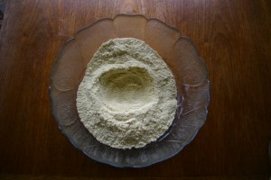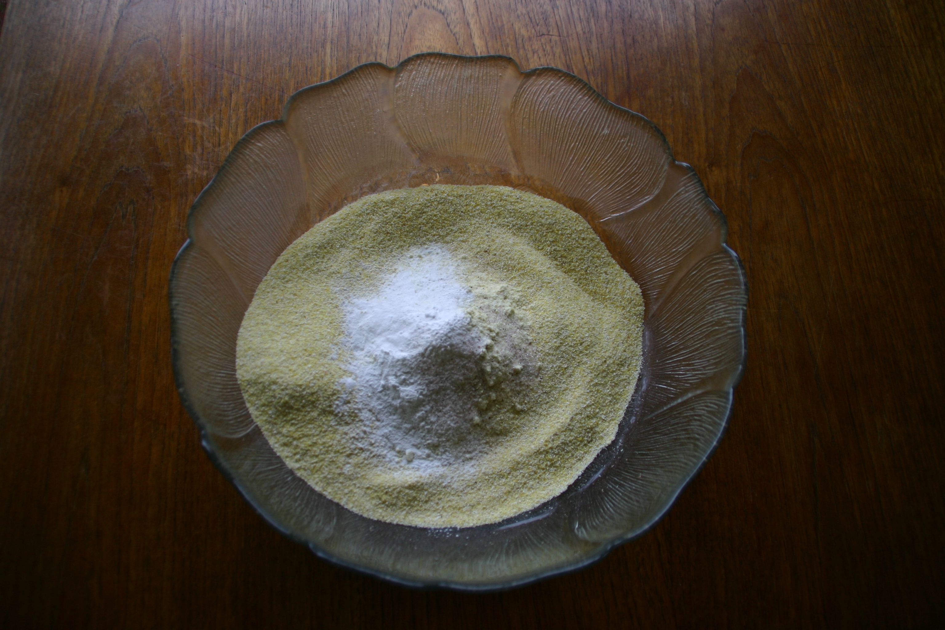 - Sift or stir together dry ingredients then stir in cornmeal and make a well at the center