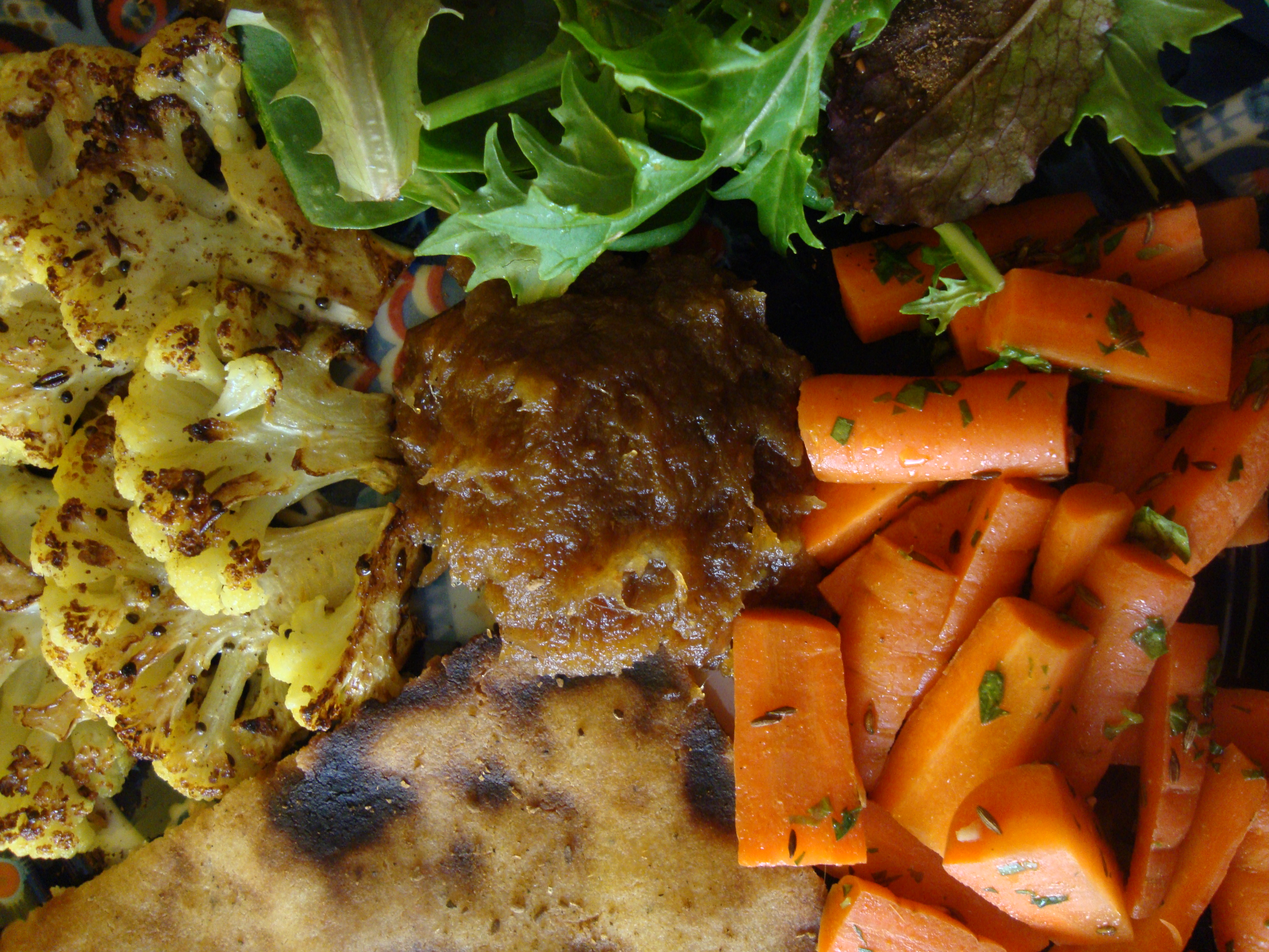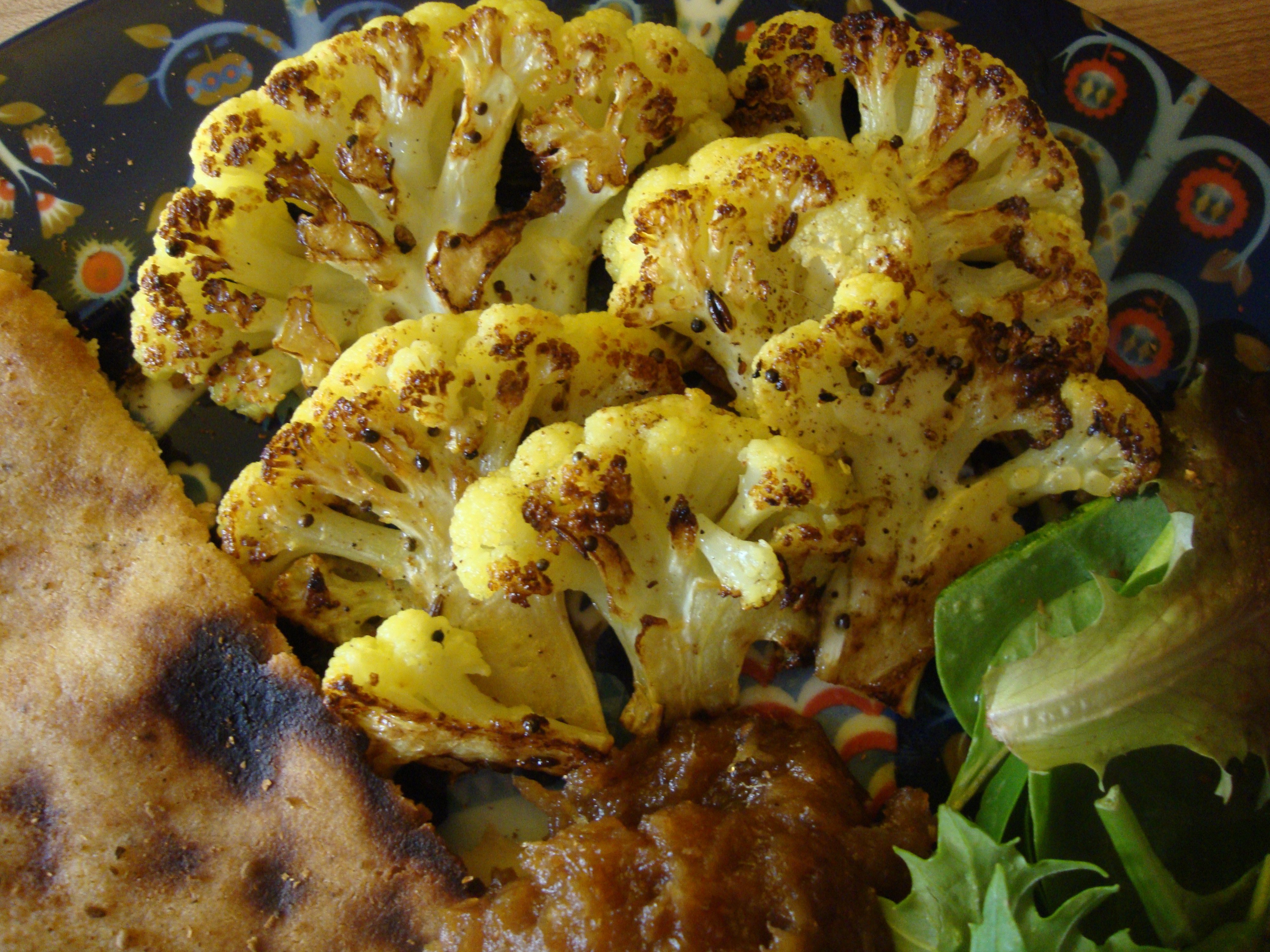 This gives you flavourful, juicy, browned cauliflower to which you can apply any number of flavour profiles. I encourage you to experiment! I rummaged around my spice cupboard while I waited for my cauliflower to soak. I fried some black mustard, fennel and cumin seeds in mild oil and then added the cauliflower. When the cauliflower was brown I sprinkled it with turmeric, cayenne pepper and salt and then finished it in about 4 tablespoons of lemon juice. I sprinkled it with garam masala before eating it. This cauliflower would also have been great with Baked Samosa, Spiced Cabbage, Turkey Keema, Rima’s Green Beans and probably a lot of other ones that I am forgetting!