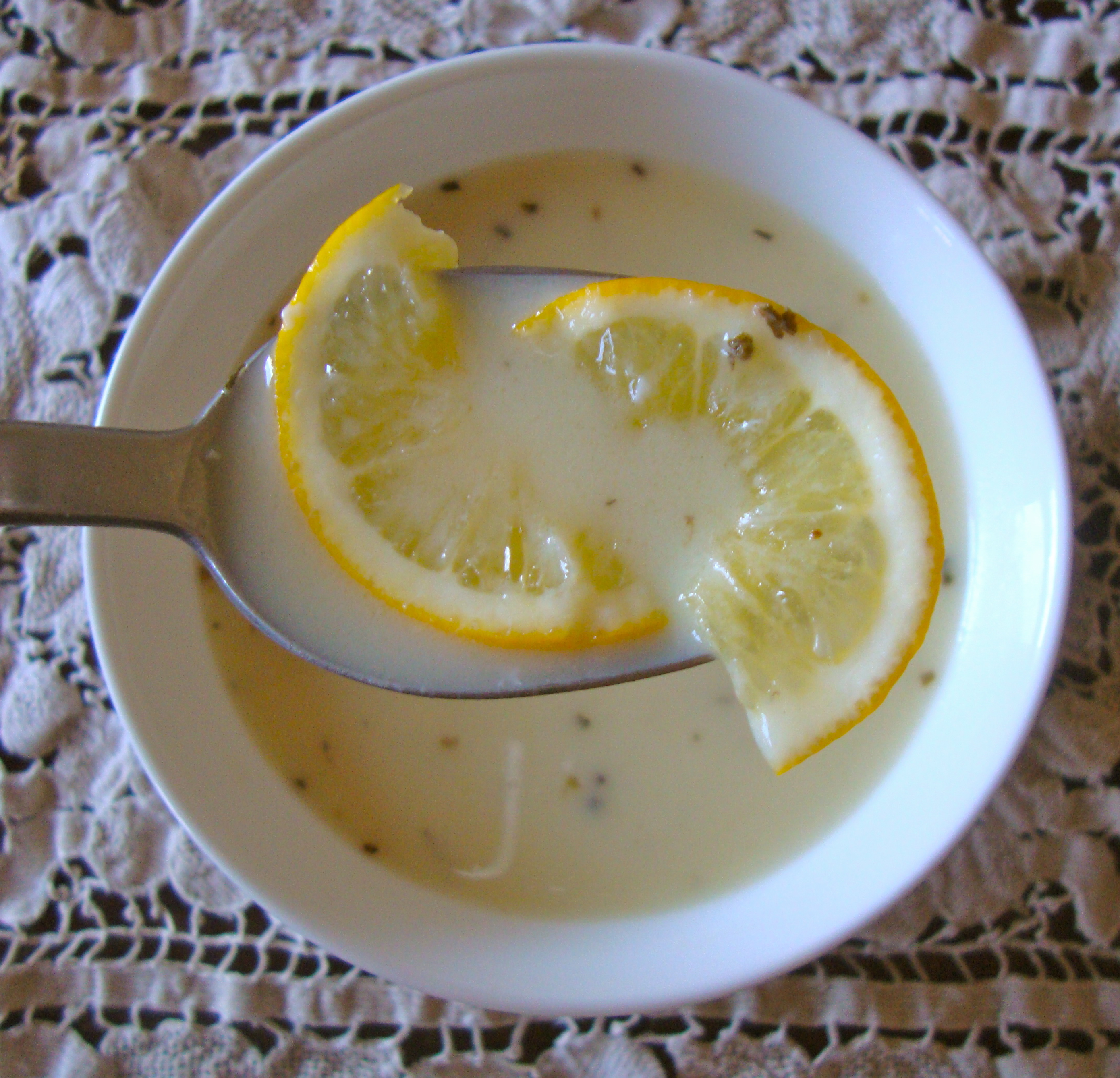 Whenever I make this soup I wonder why I don’t eat it all the time. It is inexpensive, healthful, delicious and quite elegant! If you are the sort of person who keeps good home-made soup stock on hand (I am) this soup takes only a few minutes to prepare. Aside from the soup stock the only other ingredients that absolutely requires are eggs and lemon, which I always have in my kitchen. This soup is also a good way to make use of other stuff that you might have lying around such as leafy greens that need to eaten or leftover cooked rice (or other grains). If you add some sautéed mushrooms to this soup, it is exactly the elegant lemony cream of mushroom soup that I was seeking when I started adding lots of lemon juice to canned cream of mushroom soup as a pre-teen.