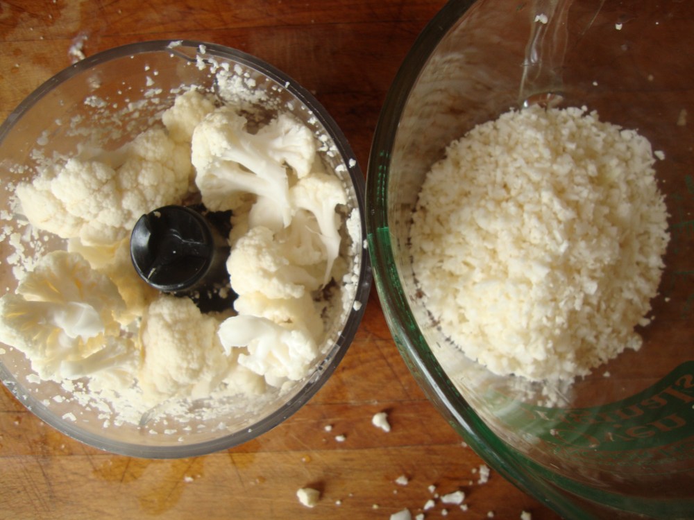 * To shred cauliflower in a blender, half-fill the container with water. Add 1 cup of chopped cauliflower, cover and pulse 5 or 6 times until finely shredded. Pour into a sieve and strain, and press out extra water. Repeat until all cauliflower is shredded (This is how Tony has done it. I just whirred it up in my little food processor, but I had to add extra water later)