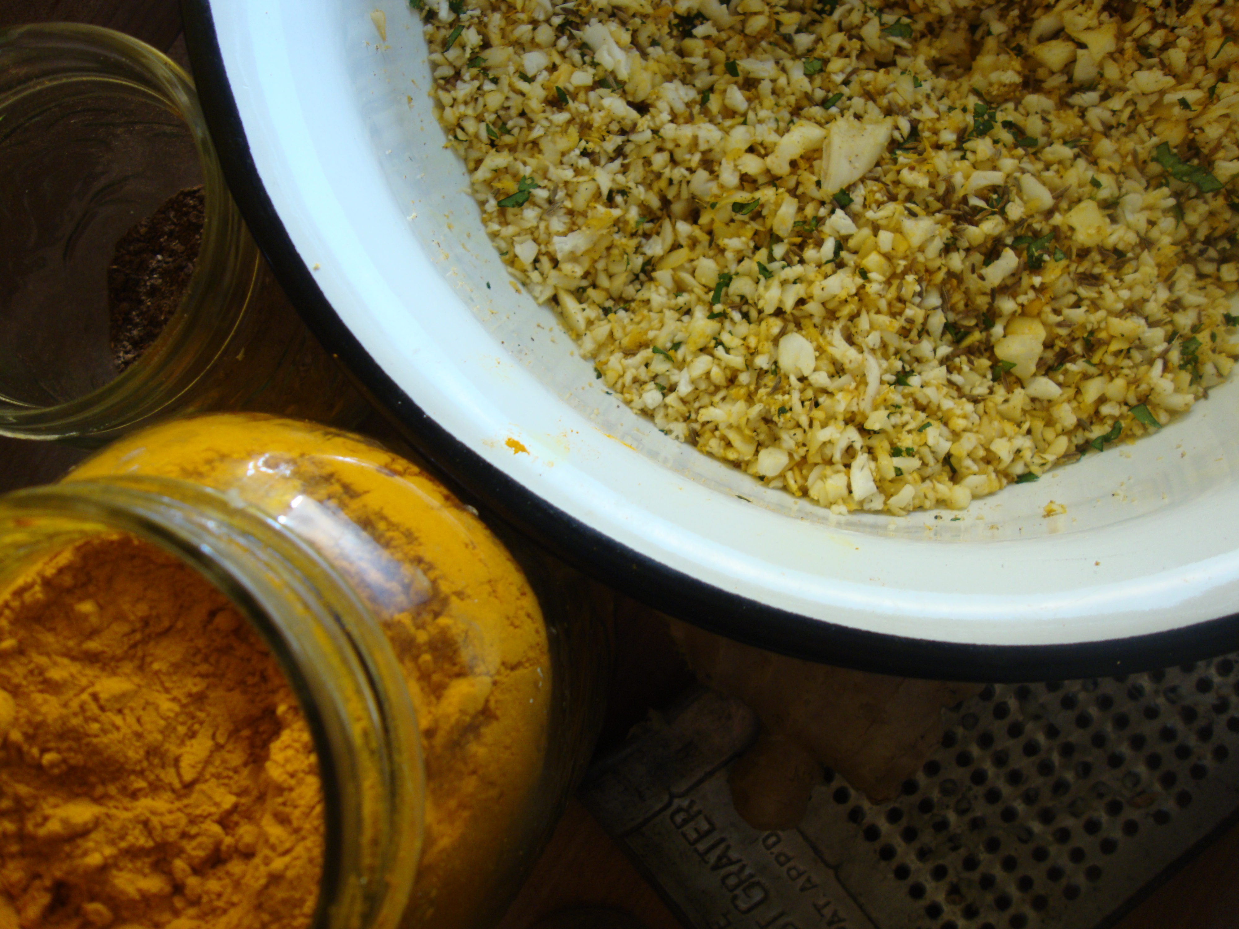 1. Combine the cauliflower, ginger, turmeric, cumin seeds, garam masala, and fresh herb in a mixing bowl and toss. In a smaller bowl, blend the chickpea flour with baking powder and salt.