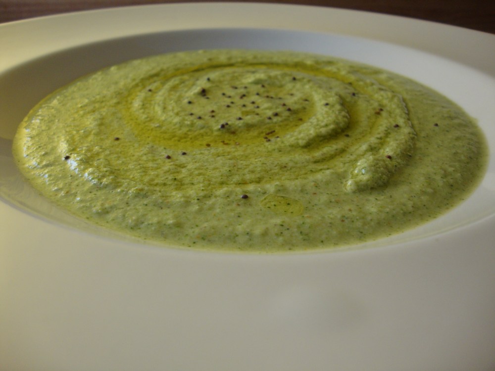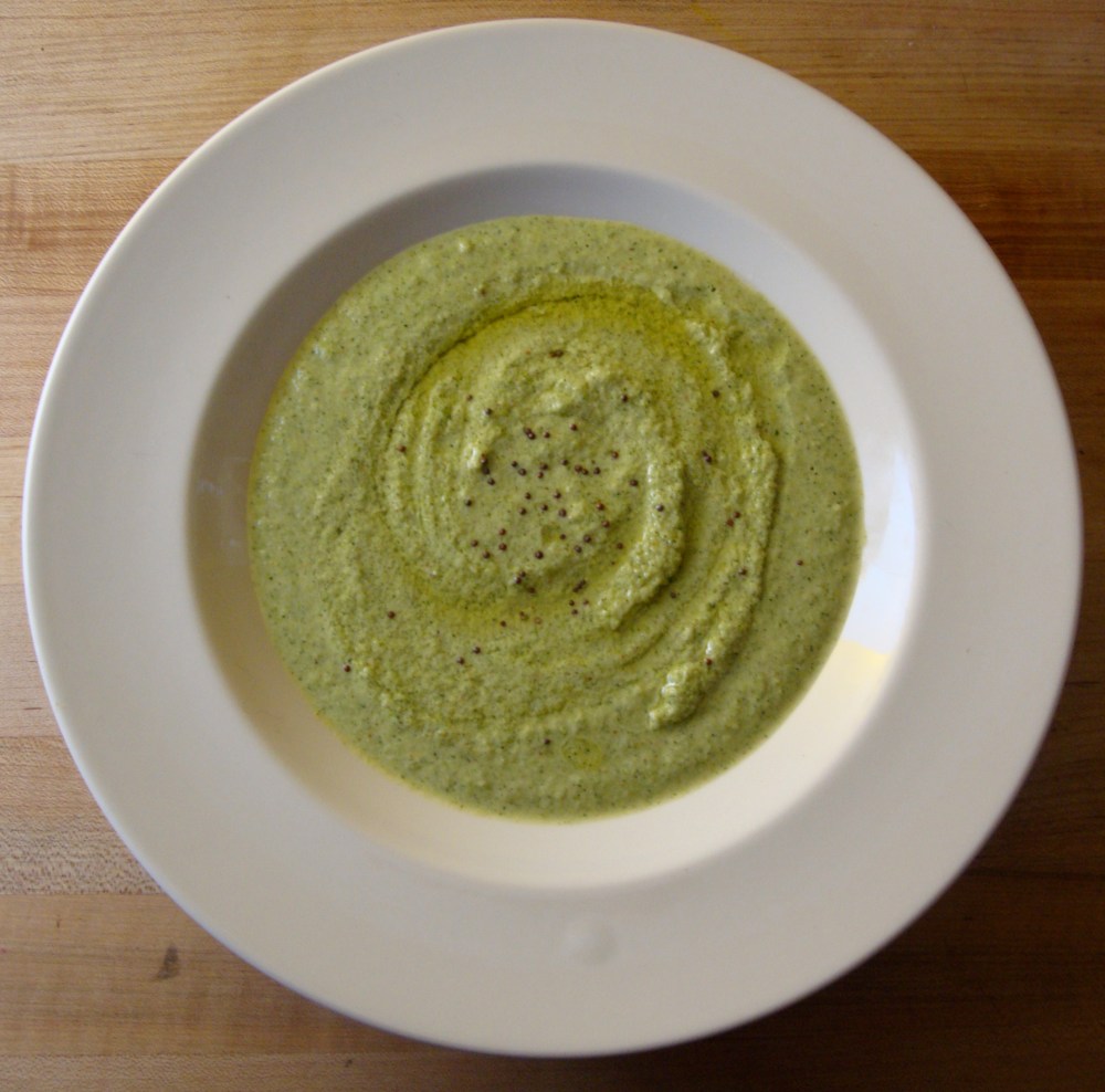 I have a broccoli soup recipe from the New Vegetarian Epicure which I absolutely adore. I was not on the prowl for a new broccoli soup, but I found this one interesting because, like my new favourite cream of mushroom soup recipe, it uses cashew cream. I have added lots and lots of spices to this soup (the original was not curried) and I have also added a good deal more oil (the original was a little too low-fat, in my opinion). I am very pleased with the result! It is good to lay off of the dairy once in a while and since I like to feed my friends, it’s also nice to have some recipes that I can make for my (many) friends who do not eat dairy. I actually don’t know too many people who are vegan, and if I make it again I may try a home-made chicken broth instead of water.