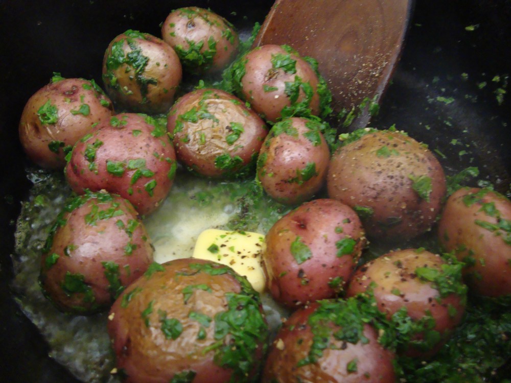 TINY NEW POTATOES AND AROMATIC GREENS STEAMED IN BUTTER