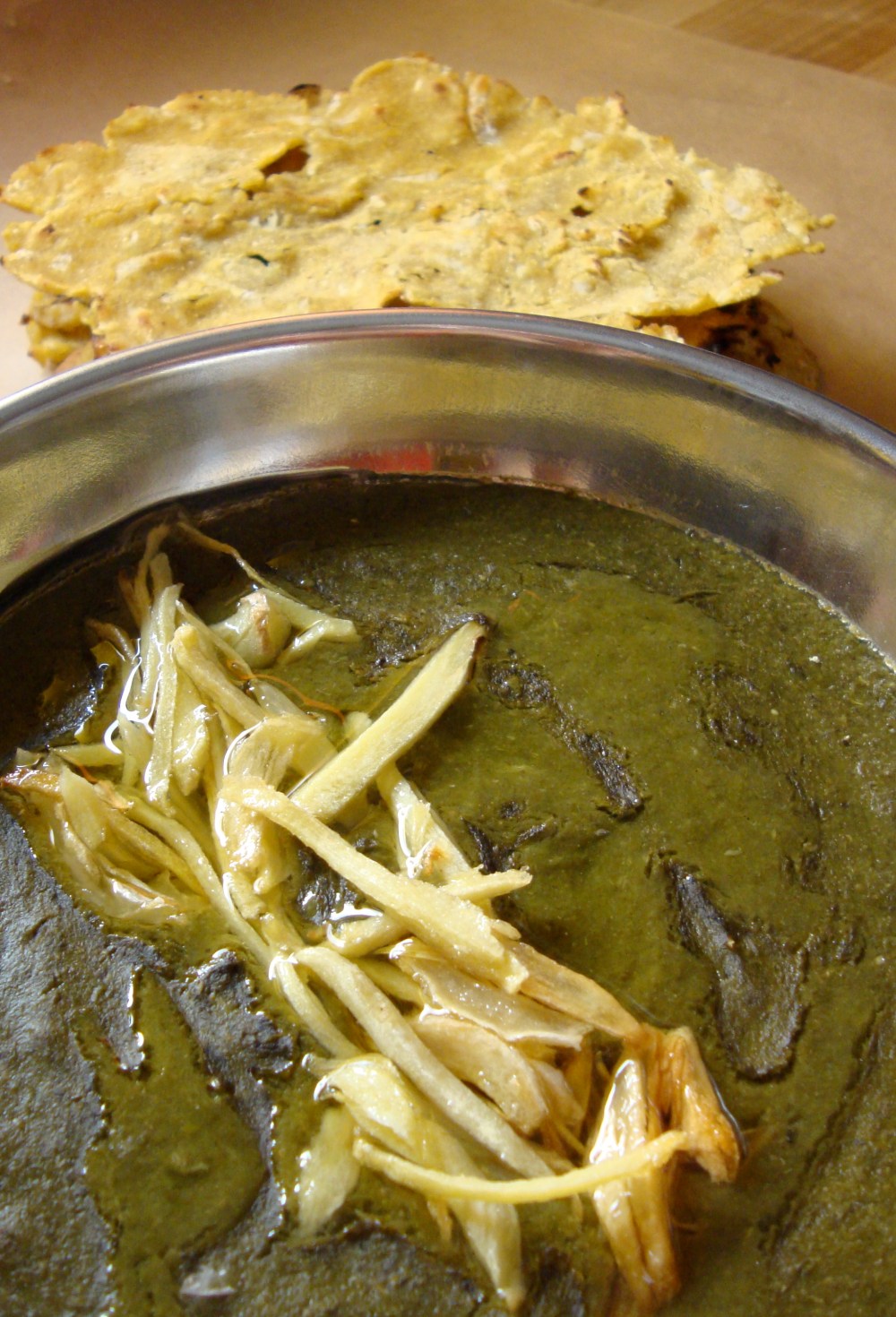 I used to make this a lot. I made it so much that I had to take a decade long break from making it, but now I am ready to eat it again! According to my favourite Indian cookbook, Classic Indian Vegetarian and Grain Cooking, this is the “soul food” of the Punjabi Sikhs. It makes sense to me. This dish is shockingly similar to Gumbo Z’herbs (greens cooked with salted pork) and cornbread, which is considered one of the big soul foods of the southern United States. What this dish lacks in pork, it makes up for in garlic and ginger infused butter. Both dishes take a huge quantity of bitter greens and cook them into a silky, spicy, rich puree meant to be sopped up with savory, crispy on the edges corn bread. Both dishes are comforting, but full of vitamins and minerals.