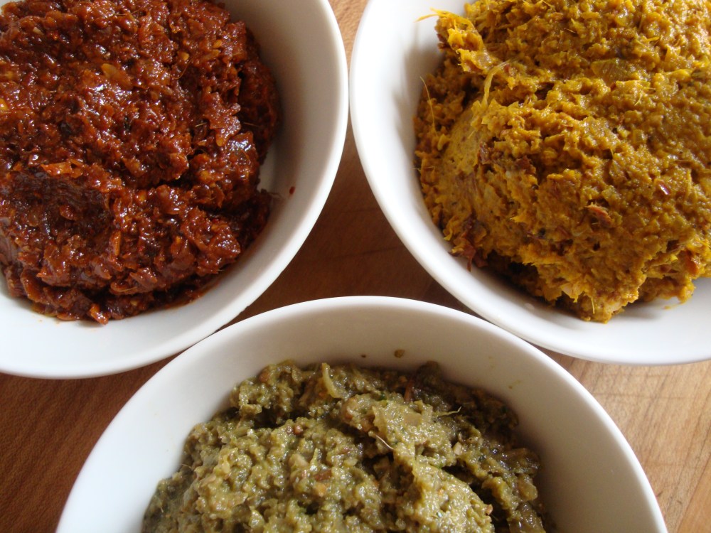 As pretty as they look piled into bowls like this, the best way to store these pastes is by scooping 2 tablespoon portions into zip lock bags and freezing them. They will keep for at least 3 months this way. I use them in a number of specific Thai dishes, but you can also use them to improvise a curry. Just heat a couple of tablespoons of the curry paste and a couple of teaspoons of coconut milk along with minced aromatics such as lemongrass, garlic, shallots, onions or ginger for a minute until they become aromatic. Add whatever meat, seafood or vegetables you wish to use along with the rest of the can of coconut milk. When everything is cooked remove the curry from the heat and season it with fish sauce, lime leaves or lime juice, a bit of sugar and maybe some fresh sliced tomato and Thai basil leaves.