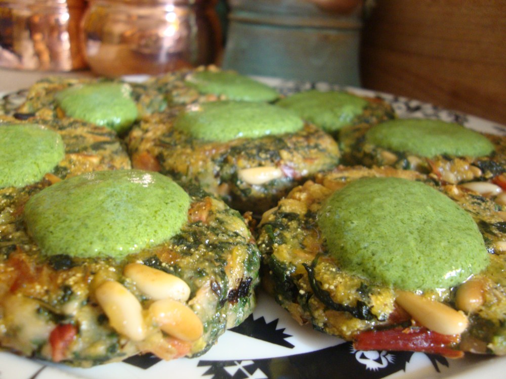 They remind me of food that we  ate when we were traveling in Bulgaria.  Sometimes I skip the herb sauce and eat them with store-bought Ajvar.  We call Ajvar cheap thrill sauce.  It is this delicious roasted red pepper and eggplant sauce imported  from Bulgaria and it is inexplicable inexpensive and delicious.  It has a wonderful bright red colour….I am regretting not adding some to the plate for the photo here…maybe I’ll add it later.