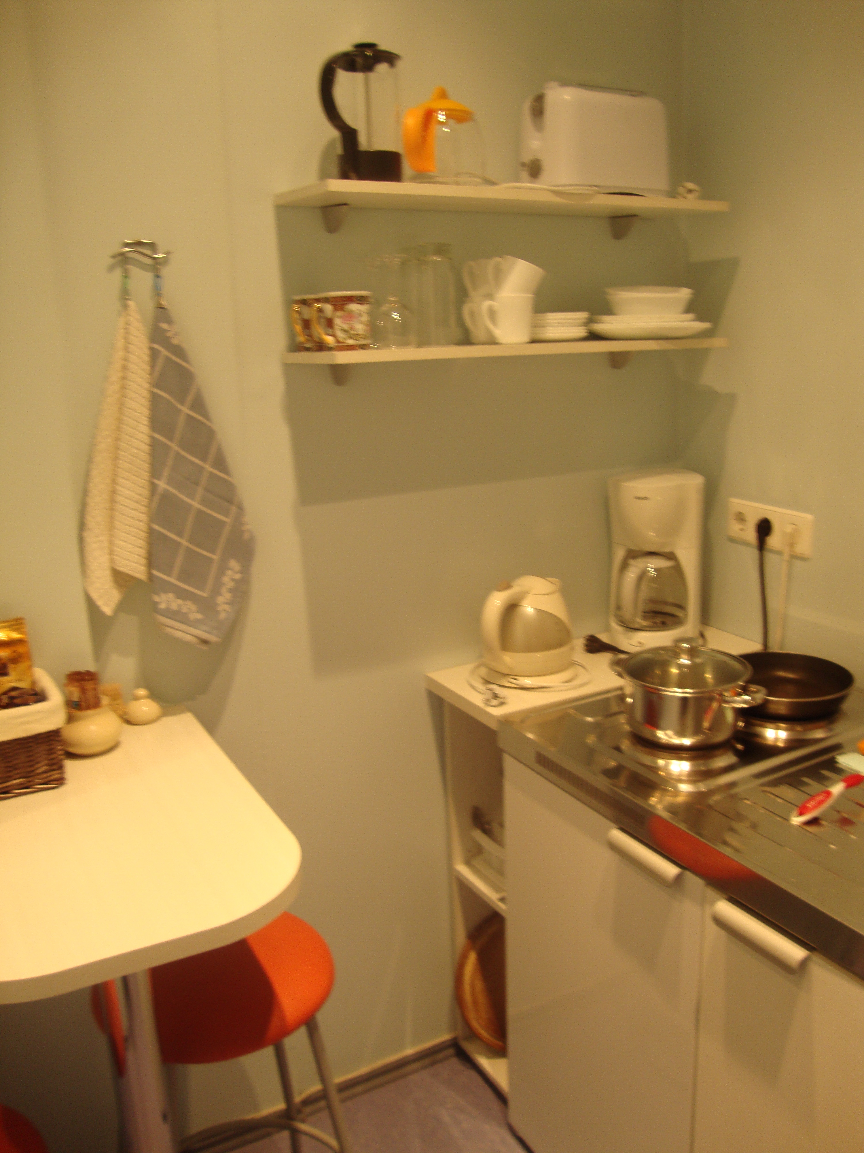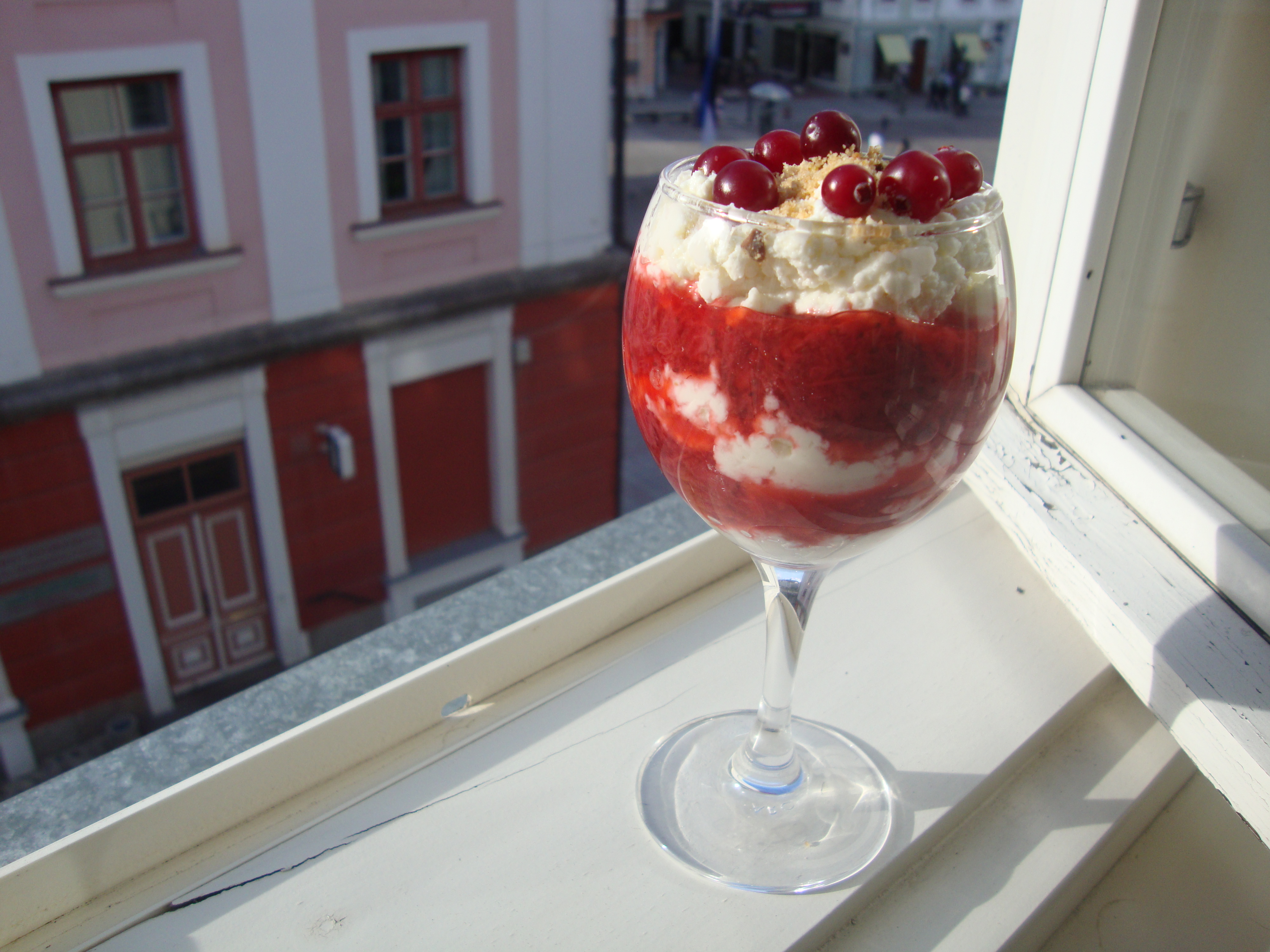 Before I left town, I made this incredibly delicious rhubarb fool with cardamom cream with Pistachio Brandy Snaps both from the impeccable food blog Lottie and Doof.  To make the brandy snaps gluten-free I use the recipe for Jeanne’s gluten-free flour mix from The Art of Gluten-Free Baking.  That’s right, I ate even more rhubarb than the numerous rhubarb posts of the last month indicate.  I promise to post recipes that involve something other than rhubarb… just as soon as I start eating something other than rhubarb.  I also am very interested in this rhubarb fool (also featuring cardamom and pistachios) that uses coconut cream, but I have not tried it yet.  If you are at home with all of the resources of your kitchen I recommend trying one of the above recipes…but let’s pretend that you are traveling and your resources are somewhat limited in an exciting and unfamiliar way.  Behold the kitchenette….If you, like me, are the kind of traveller who always makes sure to stay somewhere with a little kitchenette, a fool is the sort of dessert that you can make by stewing whatever fruit is in season locally and  layering it with the creamy dairy deliciousness that is traditional where you are visiting.  You get bonus points if you can find something crunchy and sweet to sprinkle on the top.  In truth, if the fruit is very ripe you could  even just muddle it up a bit and skip the stewing part.  I made this fool in the town of Tartu using ingredients from the local market.  It went well with the pink and red colors of the town hall which was right across from our apartment.