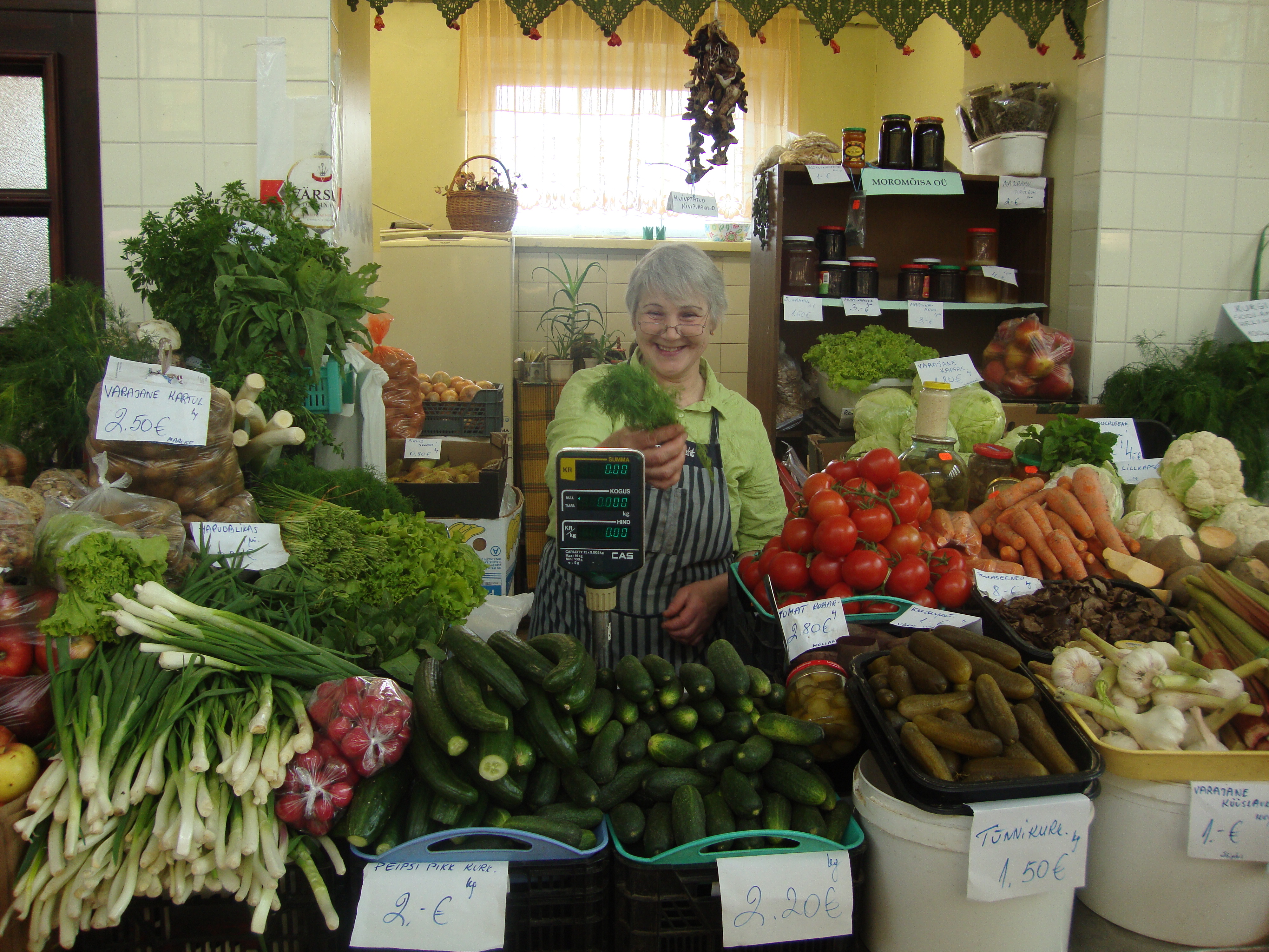 At the market right now in Estonia, you can buy sorrel, dill, cucumbers (both pickled and fresh), tomatoes, red currants, strawberries, rhubarb, red currants and lily of the valley.