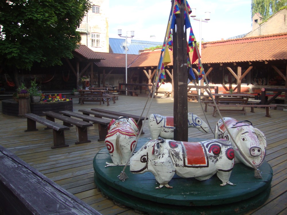 The swine carousel is in St Antonius’ courtyard, which also has a block area under a tree, a free outdoor library, many hammocks and an herb garden. There is building whre local artisans sell their wares and a communal kitchen with two brand new guest studios above it. If you, or someone htat you know wants a residency at a very well equipped studio to do textile or leather work in Tartu take a look here http://www.antonius.ee/?lang=en#kylaliskojad
