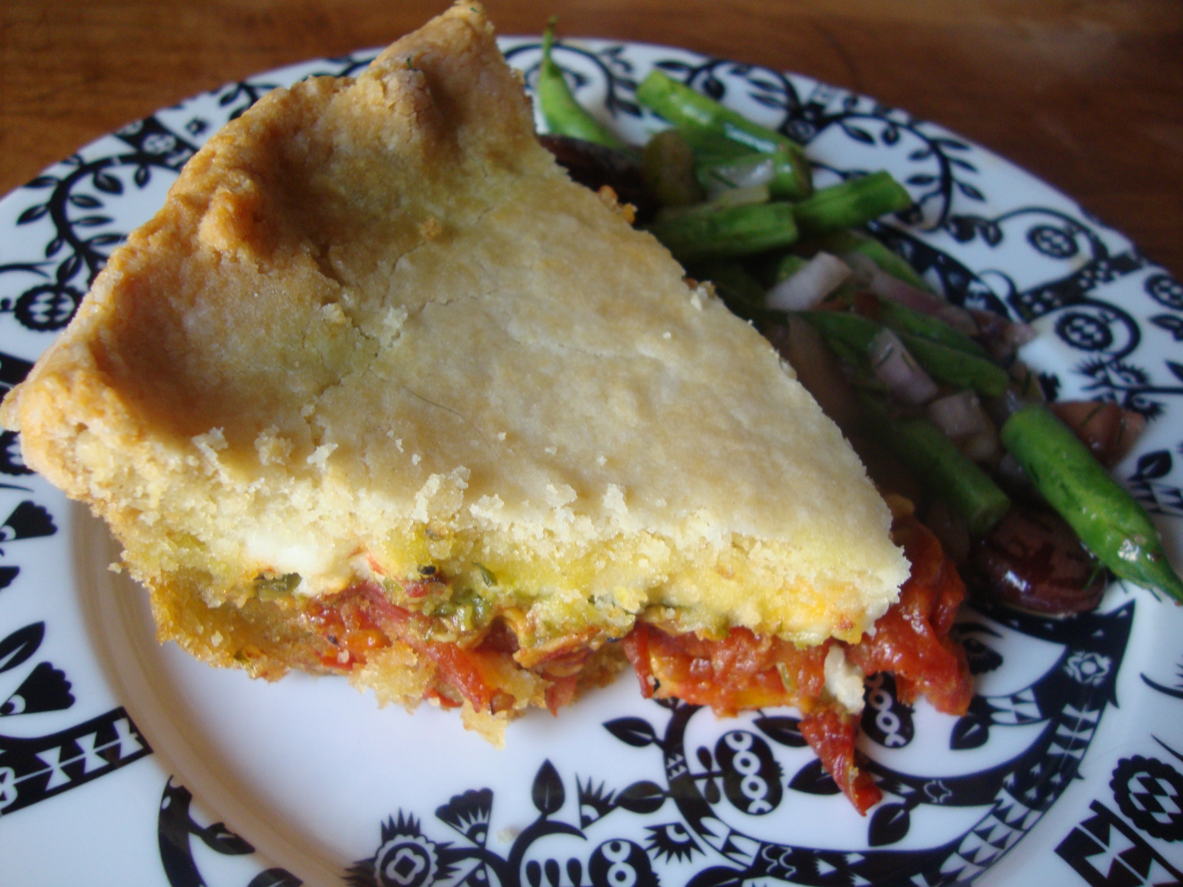 I used to make tomato pie from More Home Cooking by Laurie Colwin, which (along with Home Cooking) is one of my favourite books. Tomato Pie the epitome of summer comfort food…tomatoes baked with cheese, herbs and a bit of home-made mayonaisse in the most delicious biscuit crust. I tweaked the recipe over the years to suit me (slow roasting the tomatoes, adding pesto, using yogurt in the biscuit dough) and used it to improvise all kinds of other vegetable and fruit pies in the same biscuit crust. Try a peach pie with a biscuit dough crust or a corn, leek, mushroom and pepper pie…Yum! It was a golden key recipe for me. Then I had to stop eating gluten, and every summer I have missed eating tomato pie. This summer, I have sorted out not one, not two, but THREE gluten-free tomato pie inspired recipes. I am feeling very pleased with myself. The first is very like my version of original pie. The second is an elegant tomato ricotta tart. At the end is a recipe for a simple tomato cobbler.